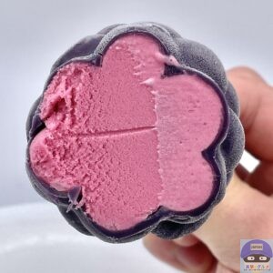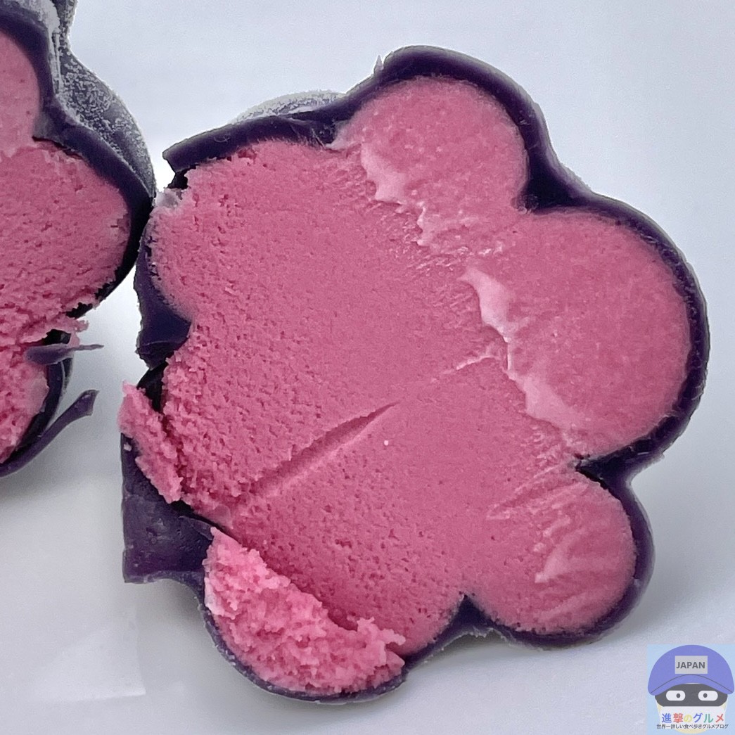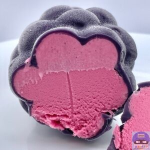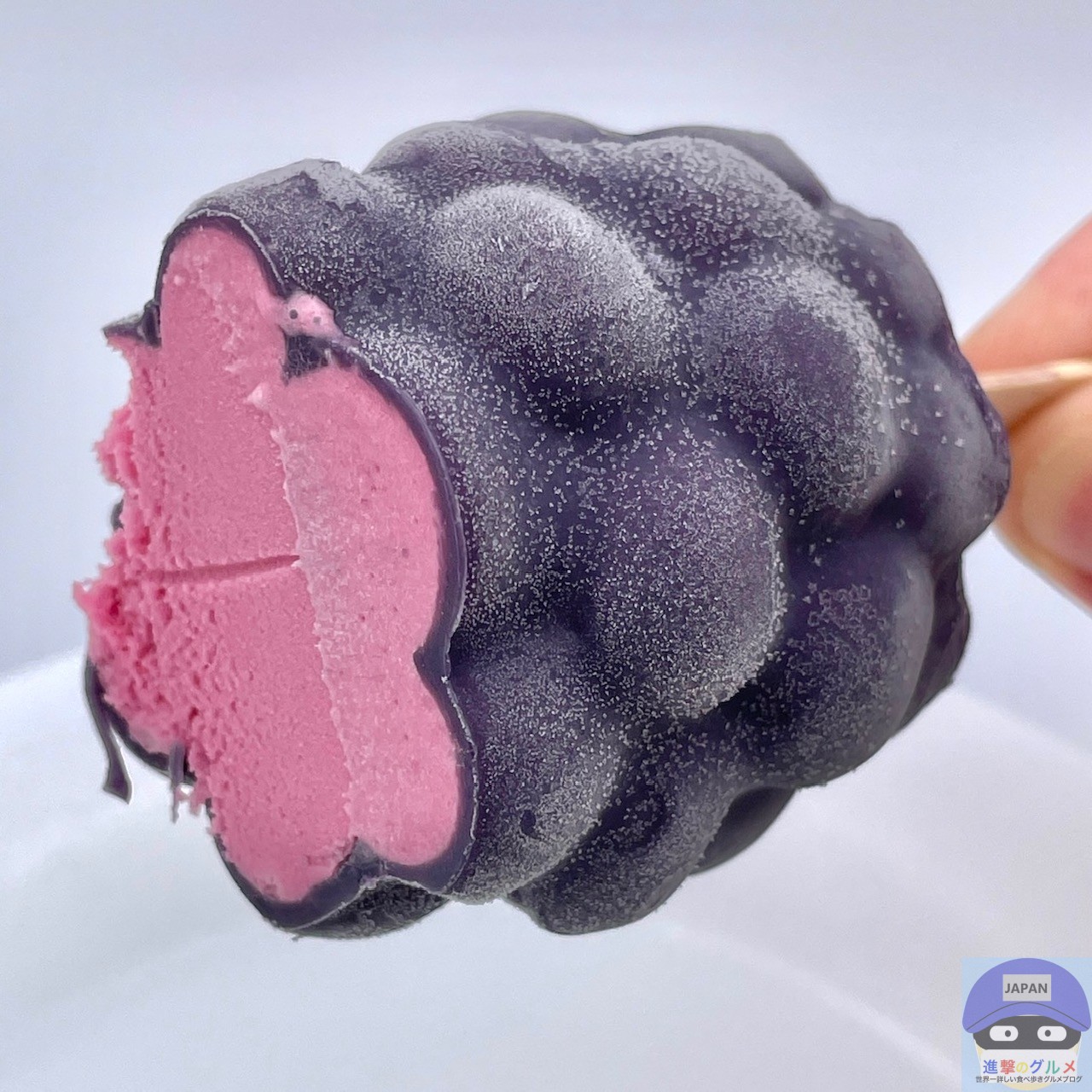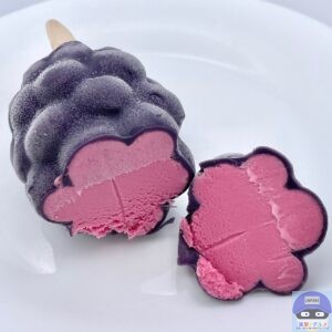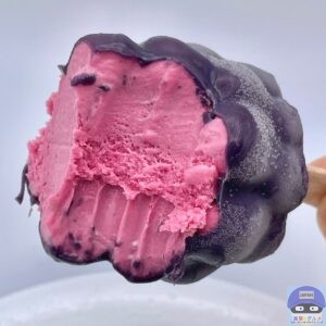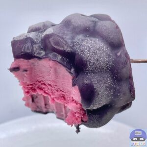 コーティングのチョコに似たやわらかな食感とほんのり甘みを感じ、ブドウアイスは、ジェラートのような歯触りでジューシーなブドウ味が広がります。