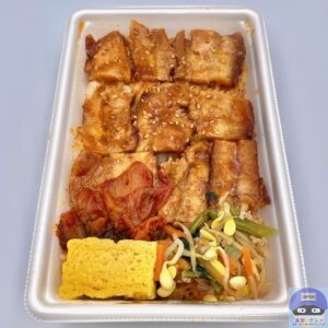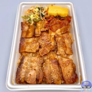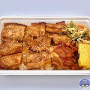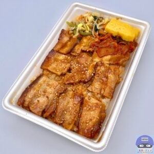 炭火で香ばしく焼き上げた豚バラ肉を、2種類のコチュジャンを配合した旨辛タレで味わう韓国風の焼肉弁当です。