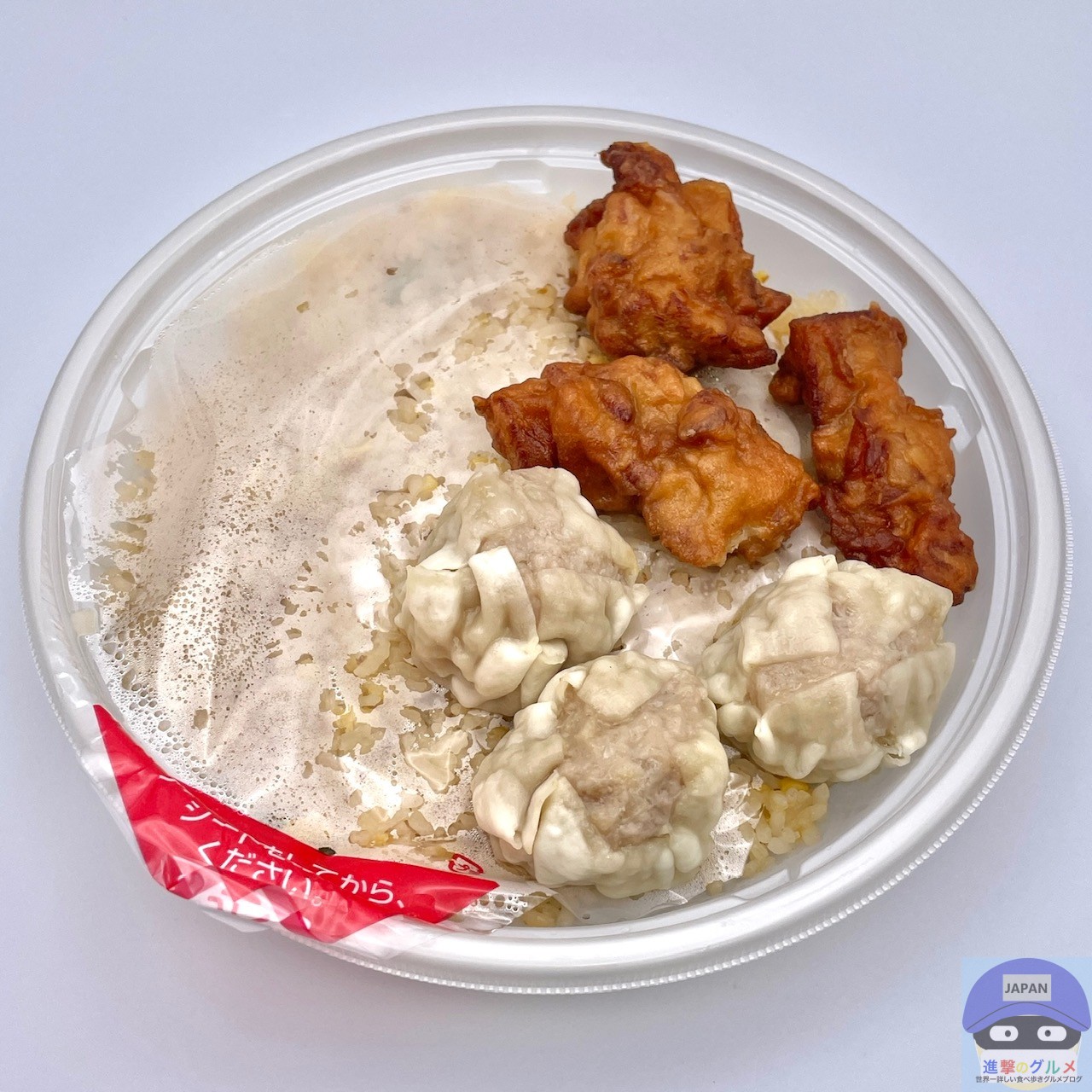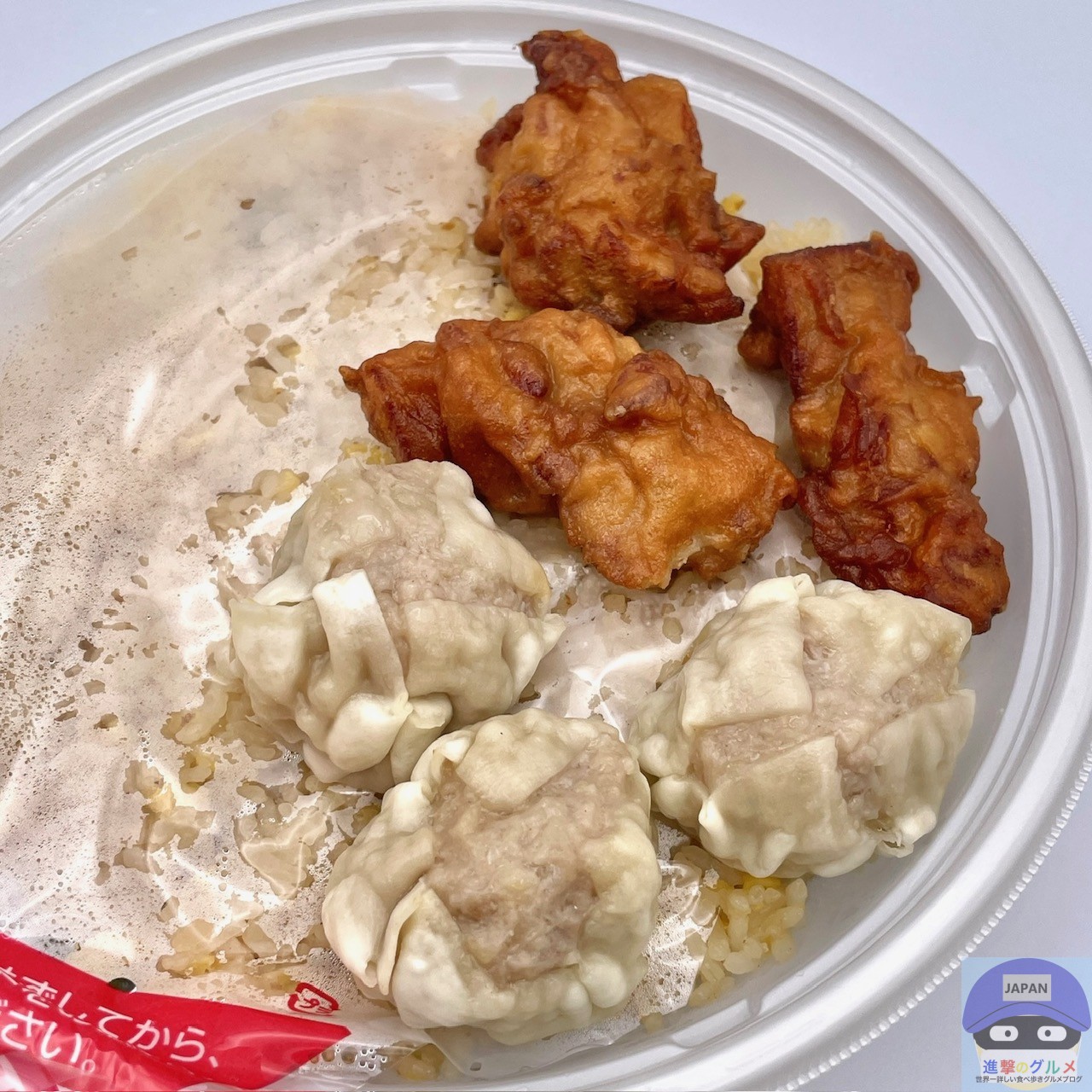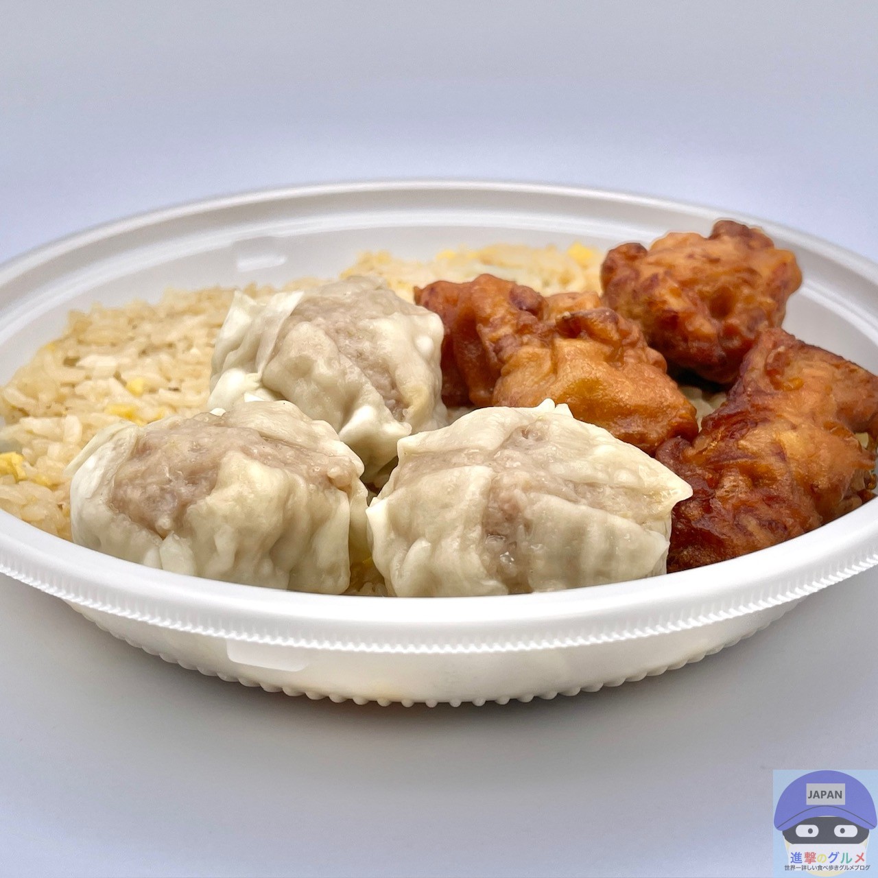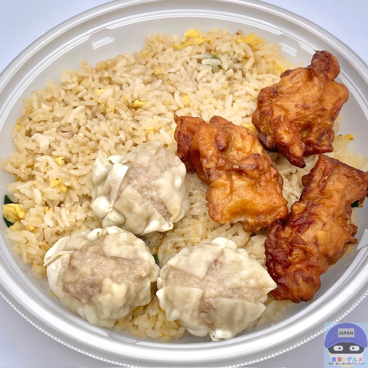 香ばしく炒めたチャーハンに焼売と唐揚げを合わせた、食欲をそそるコンビニ弁当です。