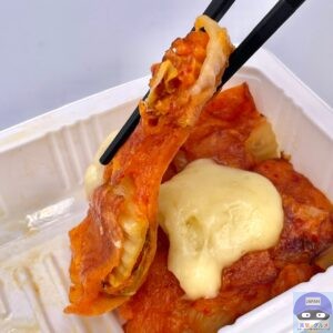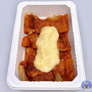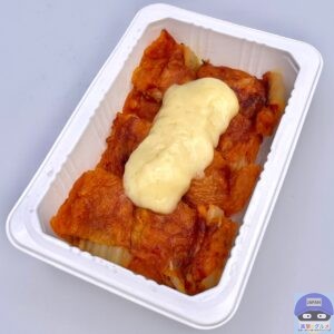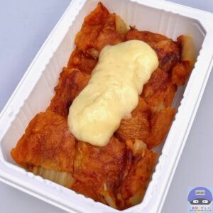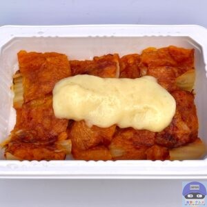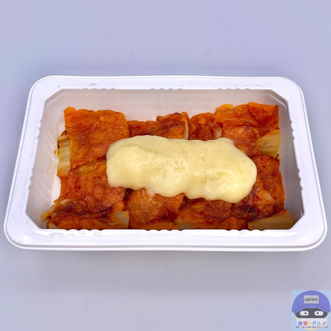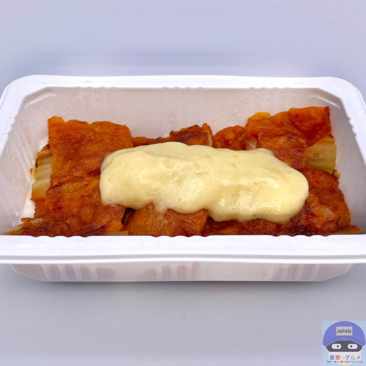 電子レンジで温めて開封すると、キムチとチーズの良い香りが食欲をそそります。