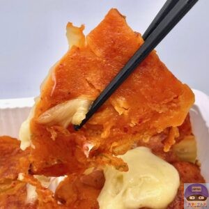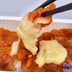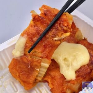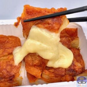 カットしたキムチチヂミにチーズをトッピングした魅力的な見た目です。