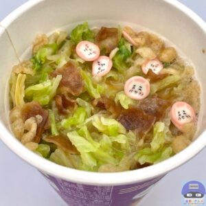 油揚げめん、粉末スープ、かやく(キャベツ、チャーシュー、揚げ玉、魚肉練り製品)などが入っています。