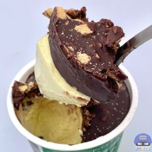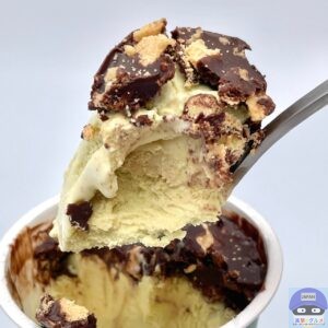 ピスタチオアイスがとろけ、ピスタチオの爽やかでコクのある味わいと甘さがトッピングと合います。