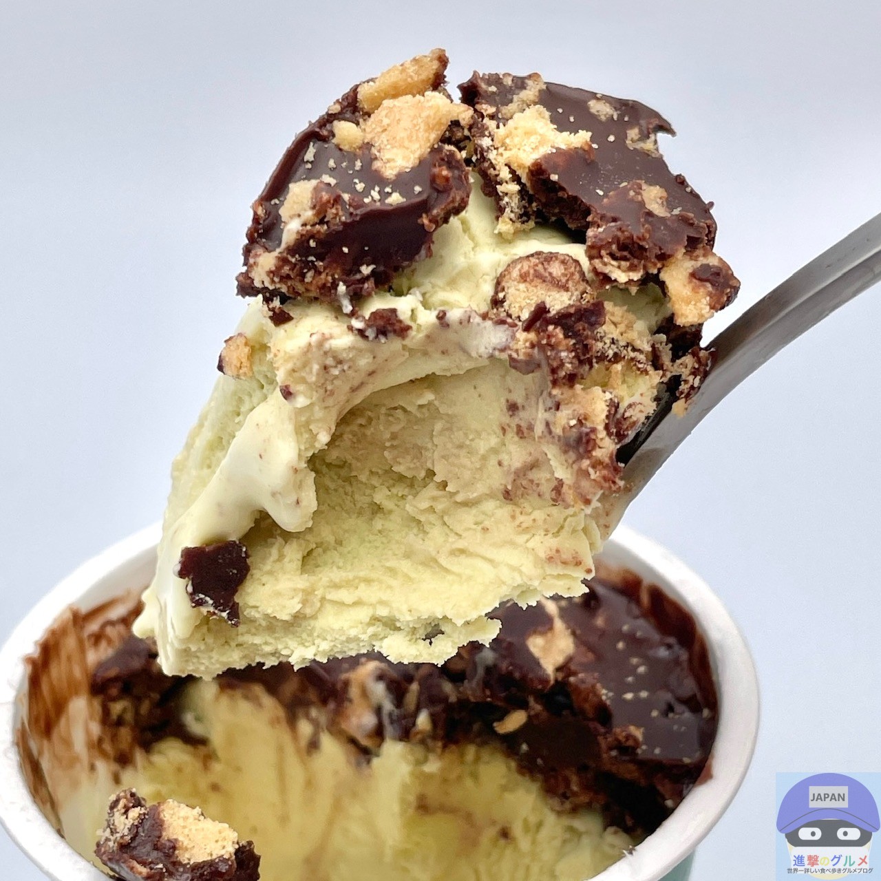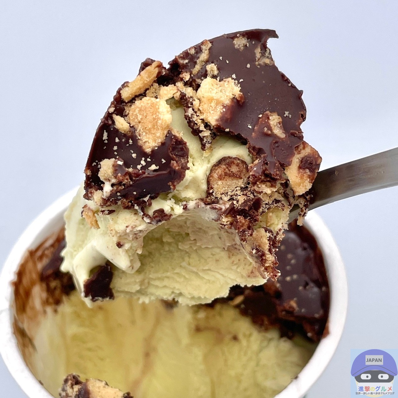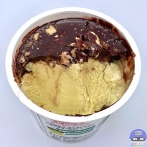 ピスタチオアイスにチョコレートコーチングとワッフルクランチをトッピングしたカップアイスです。