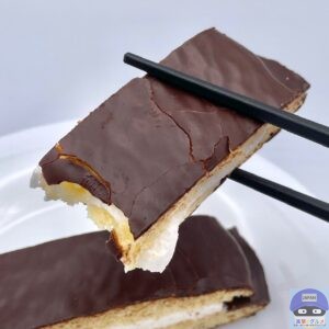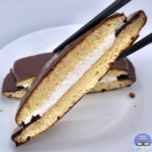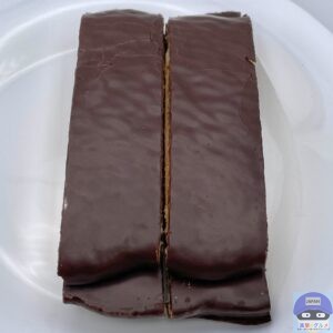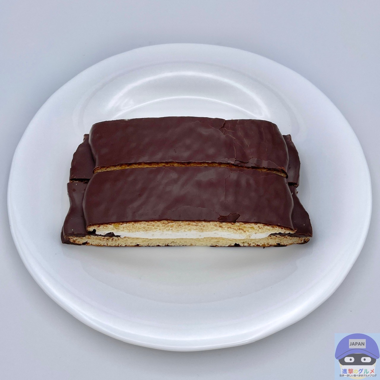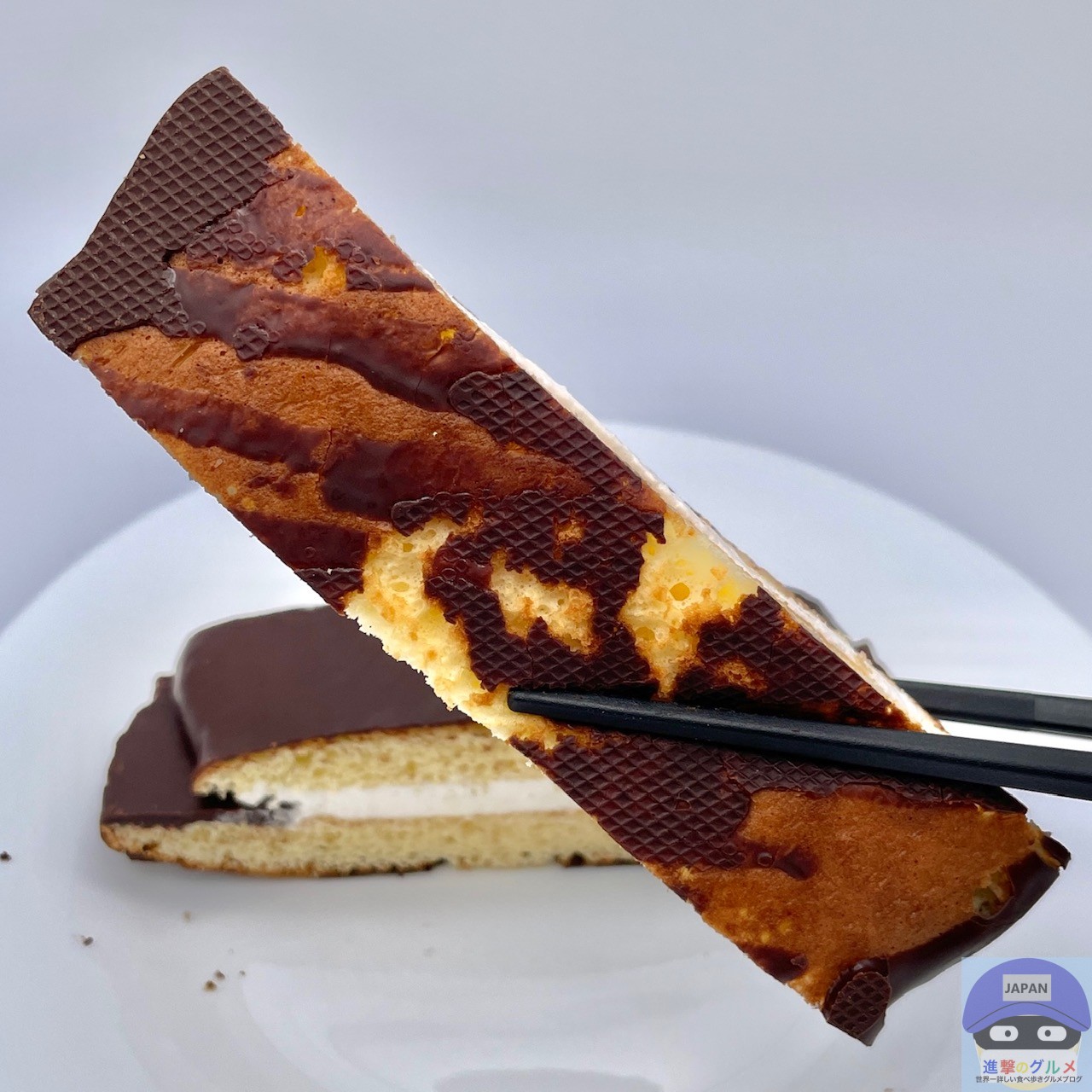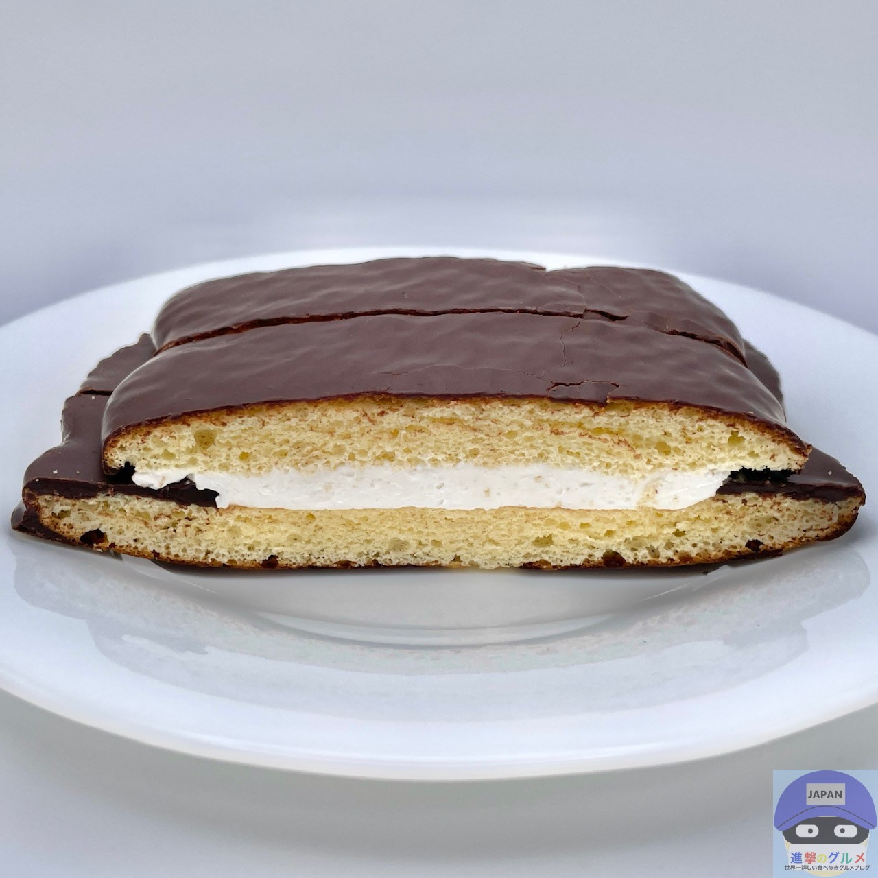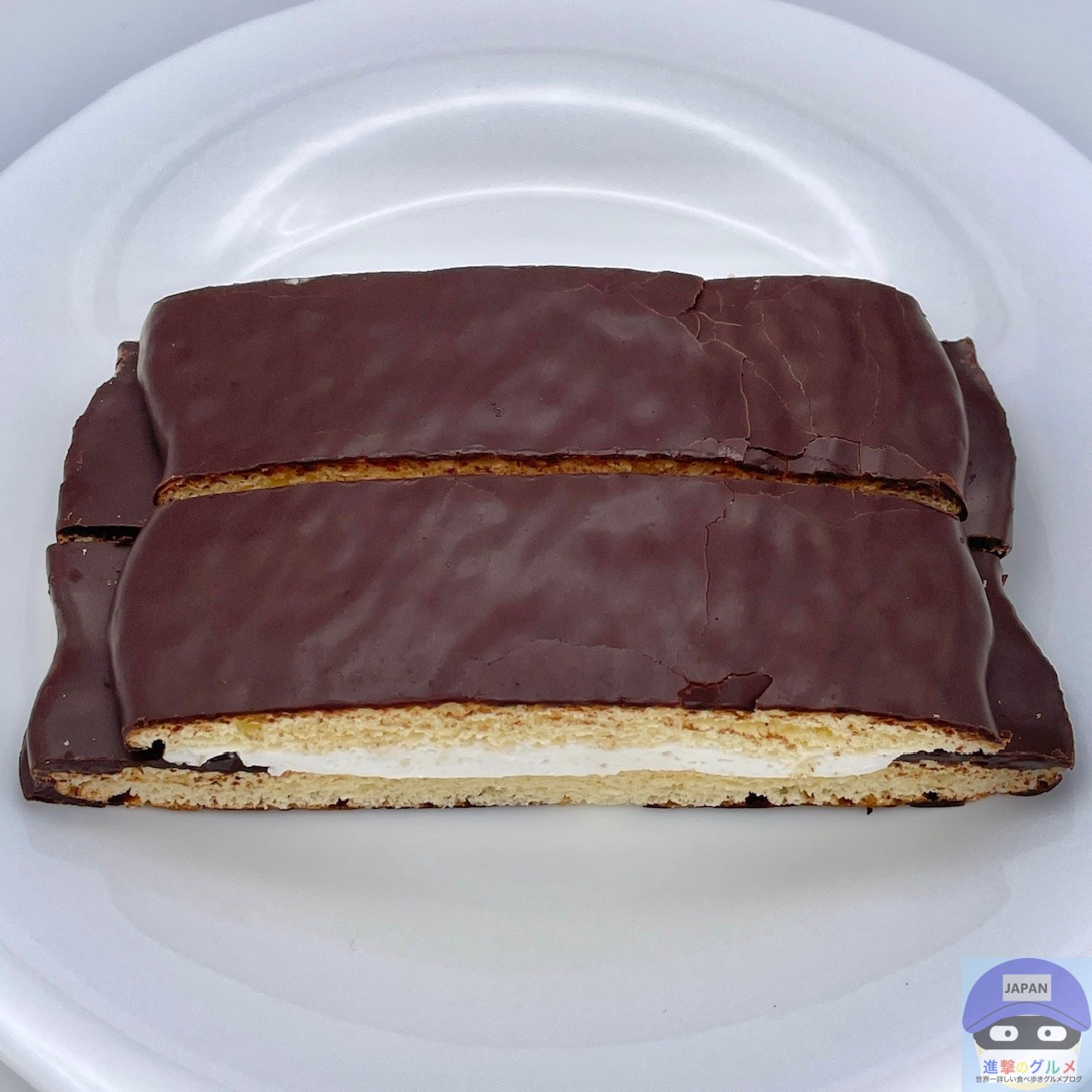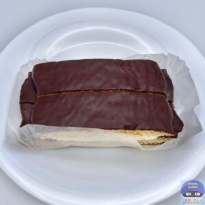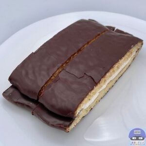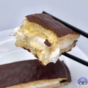 ふんわりしたスポンジ生地で端のチョコに少し厚みがあり、バニラクリームは、コクが弱めでこってりした甘さです。