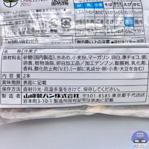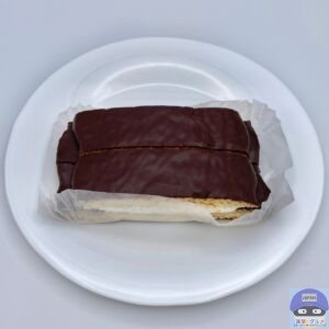 バニラクリームをサンドしたスポンジ生地にチョコをかけた、シンプルな見た目の菓子パン2本入りです。