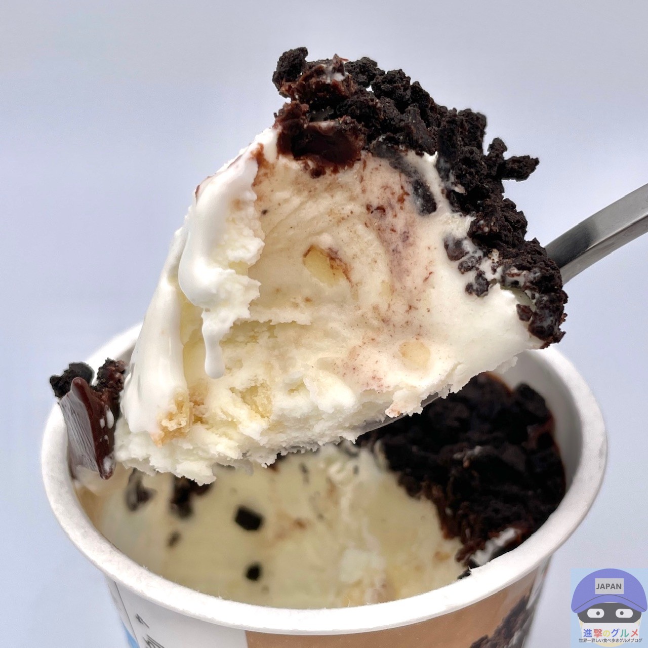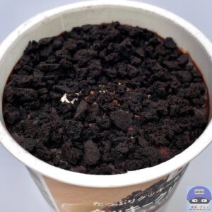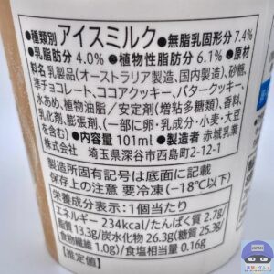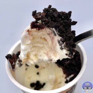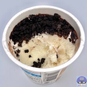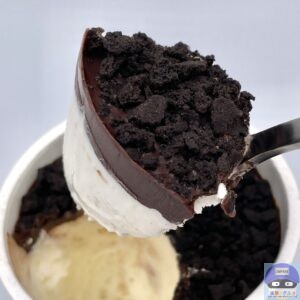 バタークッキーを混ぜ込んだミルクアイスに、チョコレートをかけてココアクッキーをたっぷりトッピングしたカップアイスです。