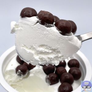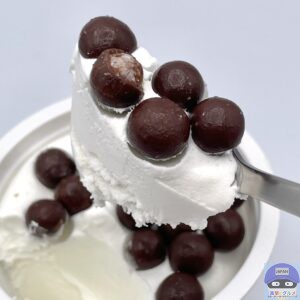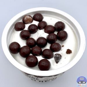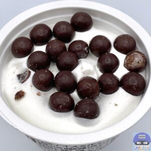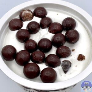 ヨーグルトアイスに丸いチョコパフをトッピングした魅力的な見た目です。