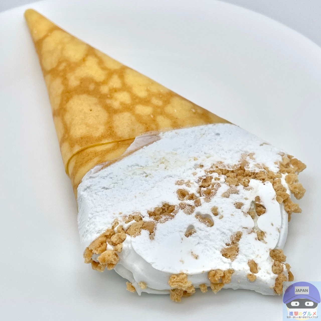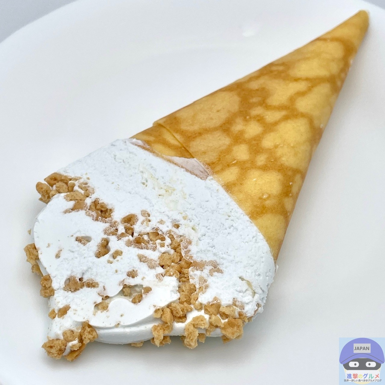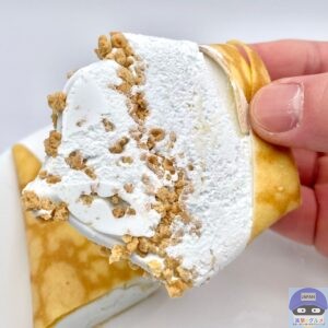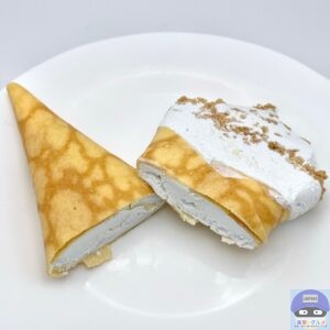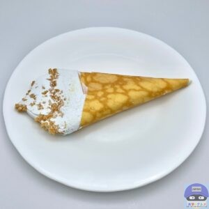 コーンフレーク入りのホワイトチョコが入ったアイスクリームを、クレープ生地で包んでビスケットクランチをトッピングしています。