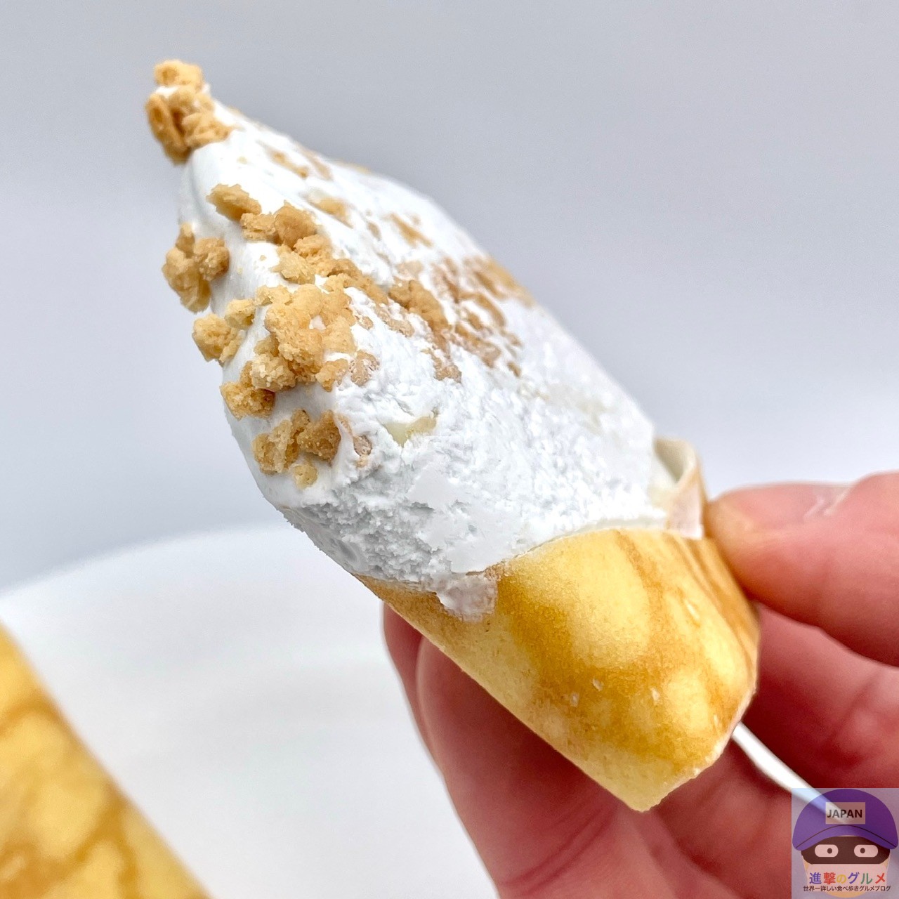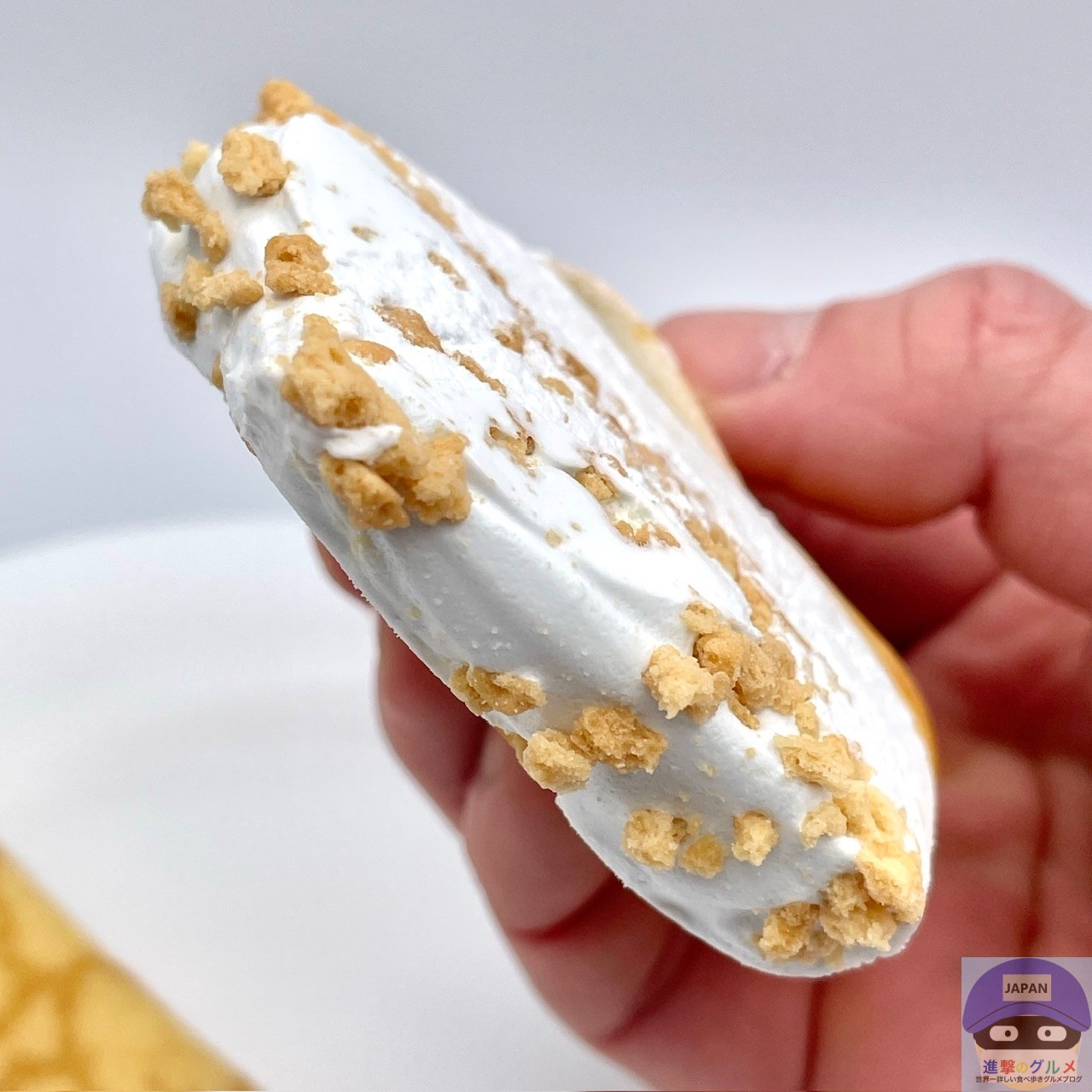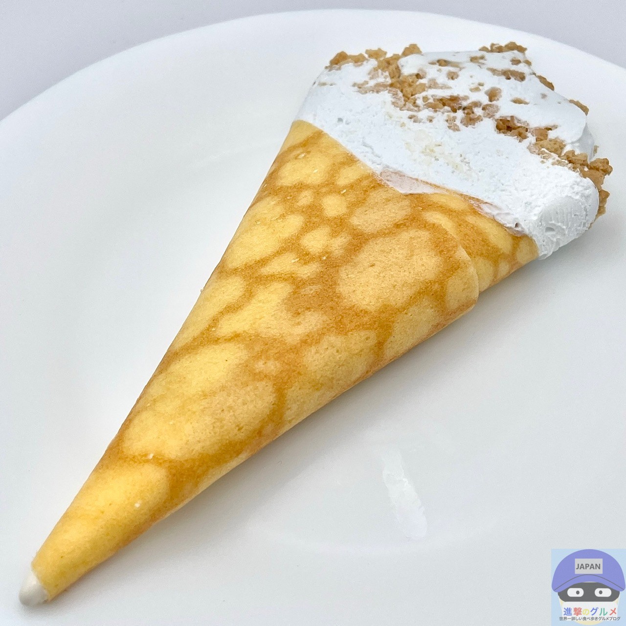 コーンフレーク入りのホワイトチョコが入ったアイスクリームを、クレープ生地で包んでビスケットクランチをトッピングしています。
