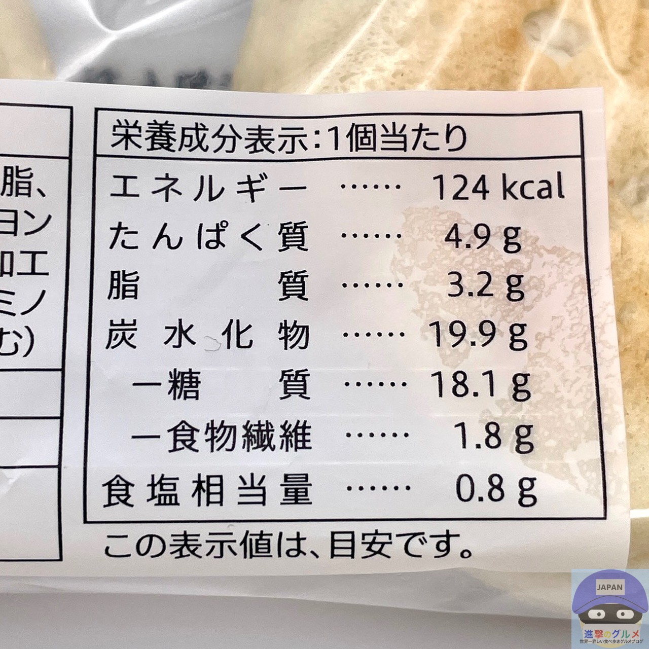 カロリーは124kcal(1個当たり)、重さは包装を含めて183gです。