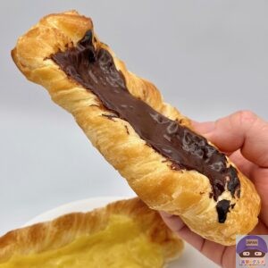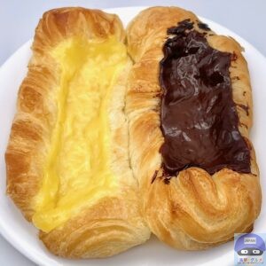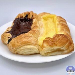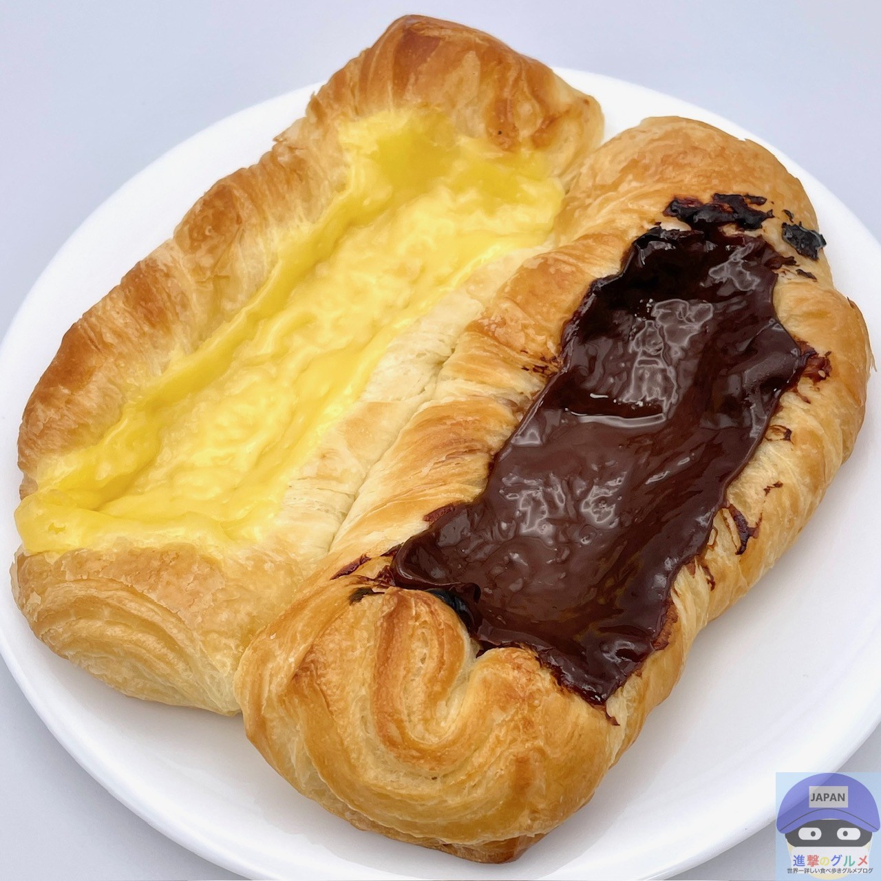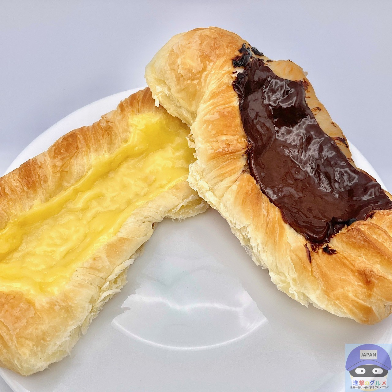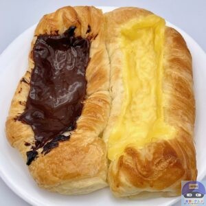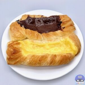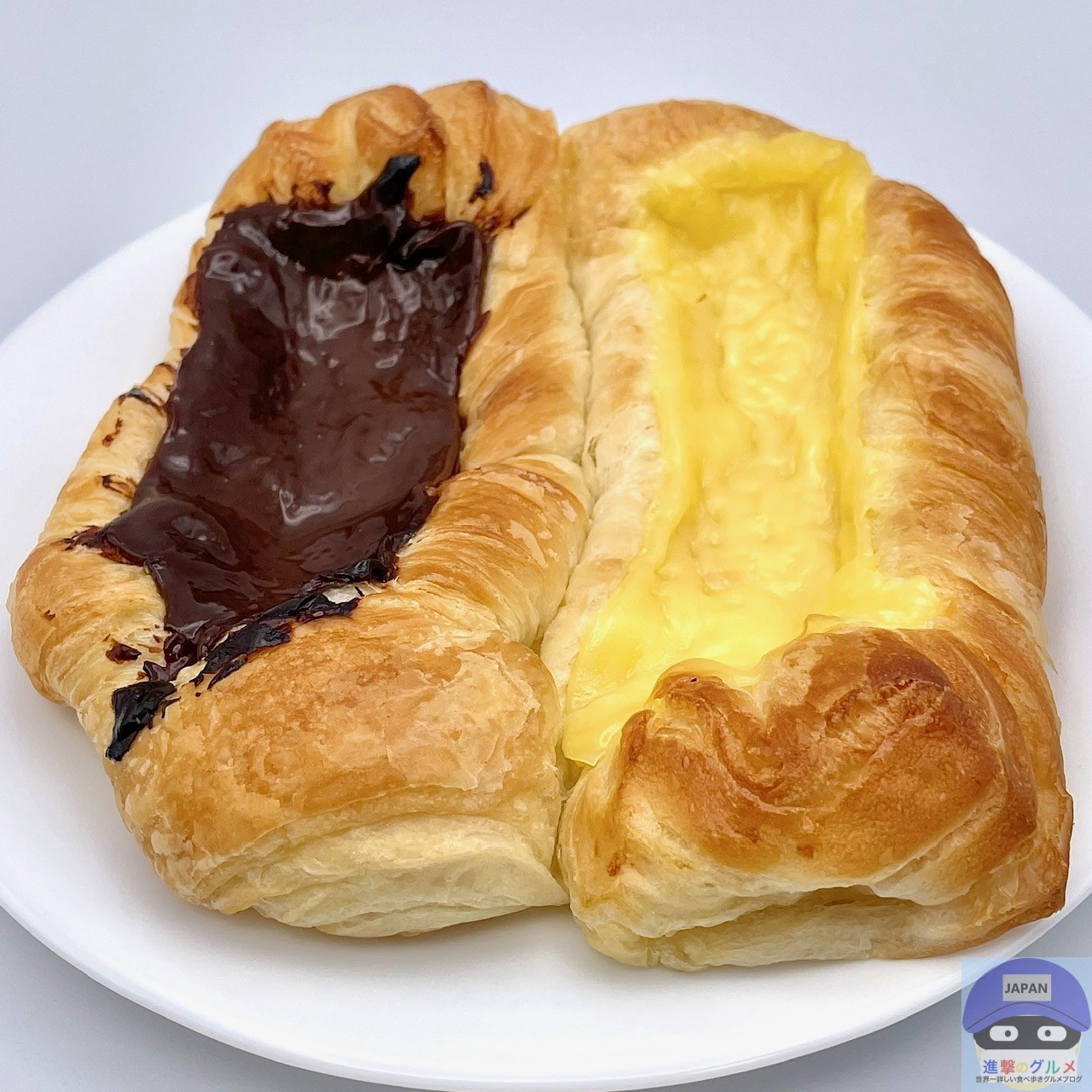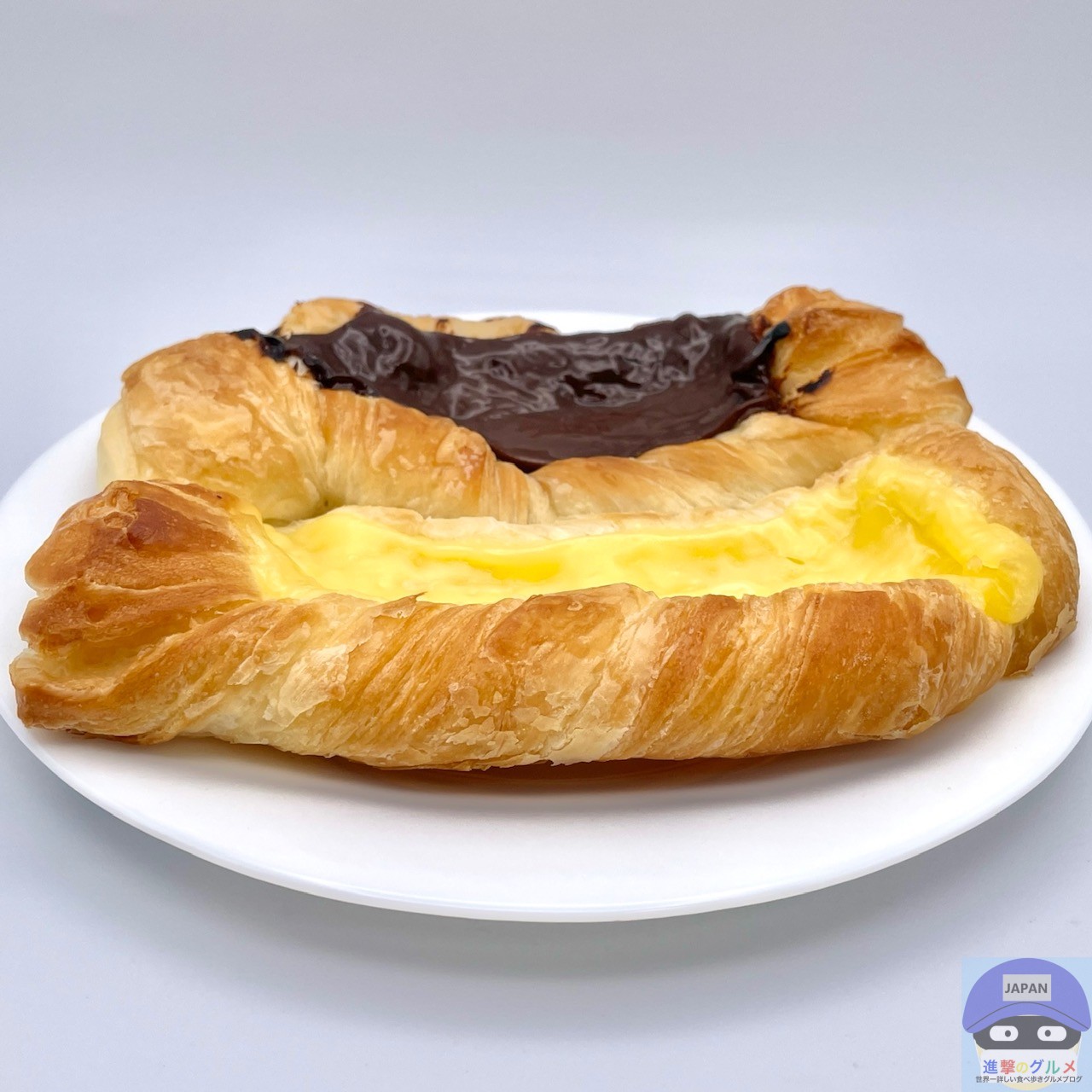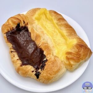 デニッシュ生地にチョコクリームとカスタードクリームを絞って焼き上げた、2種類の味わいが楽しめるコンビニ菓子パンです。