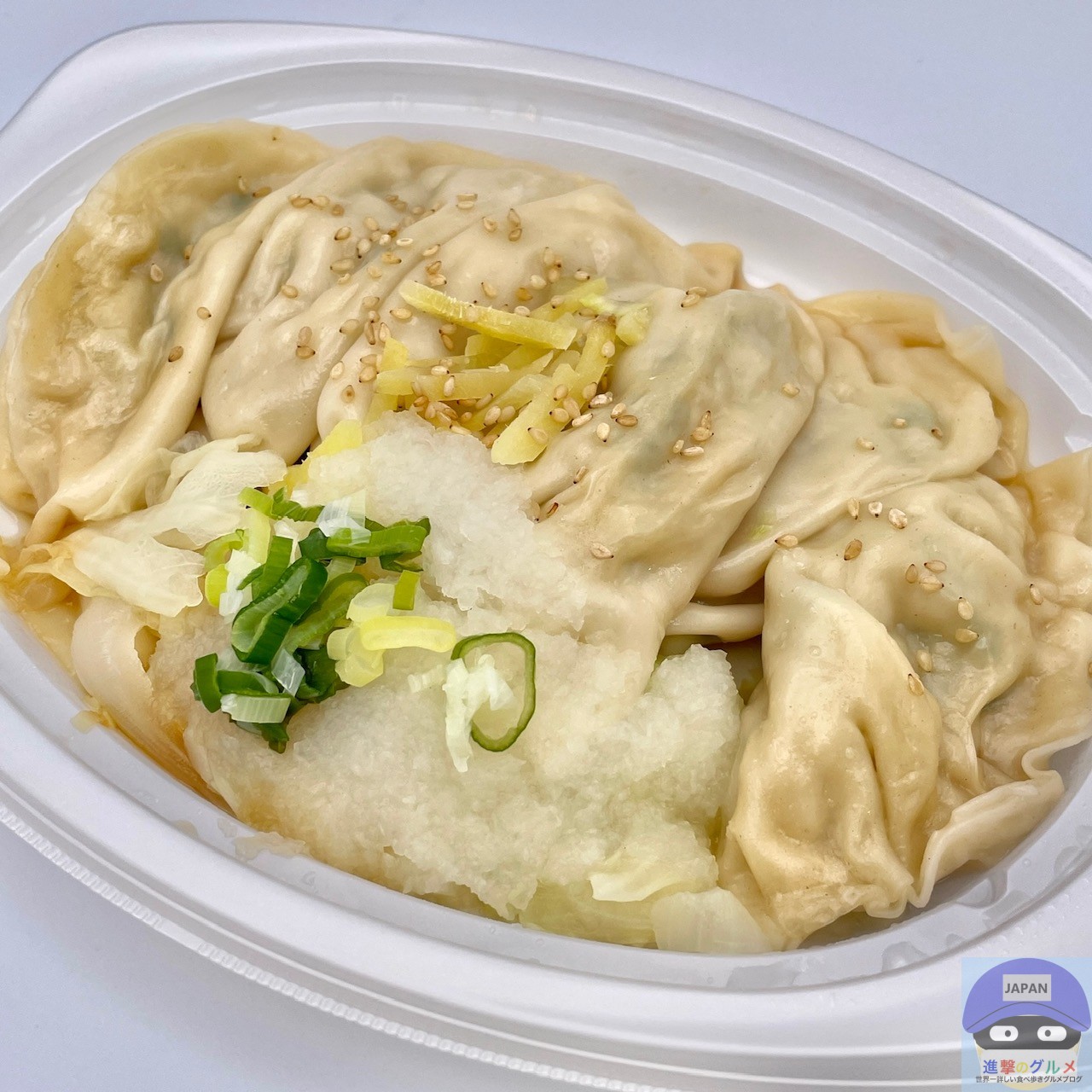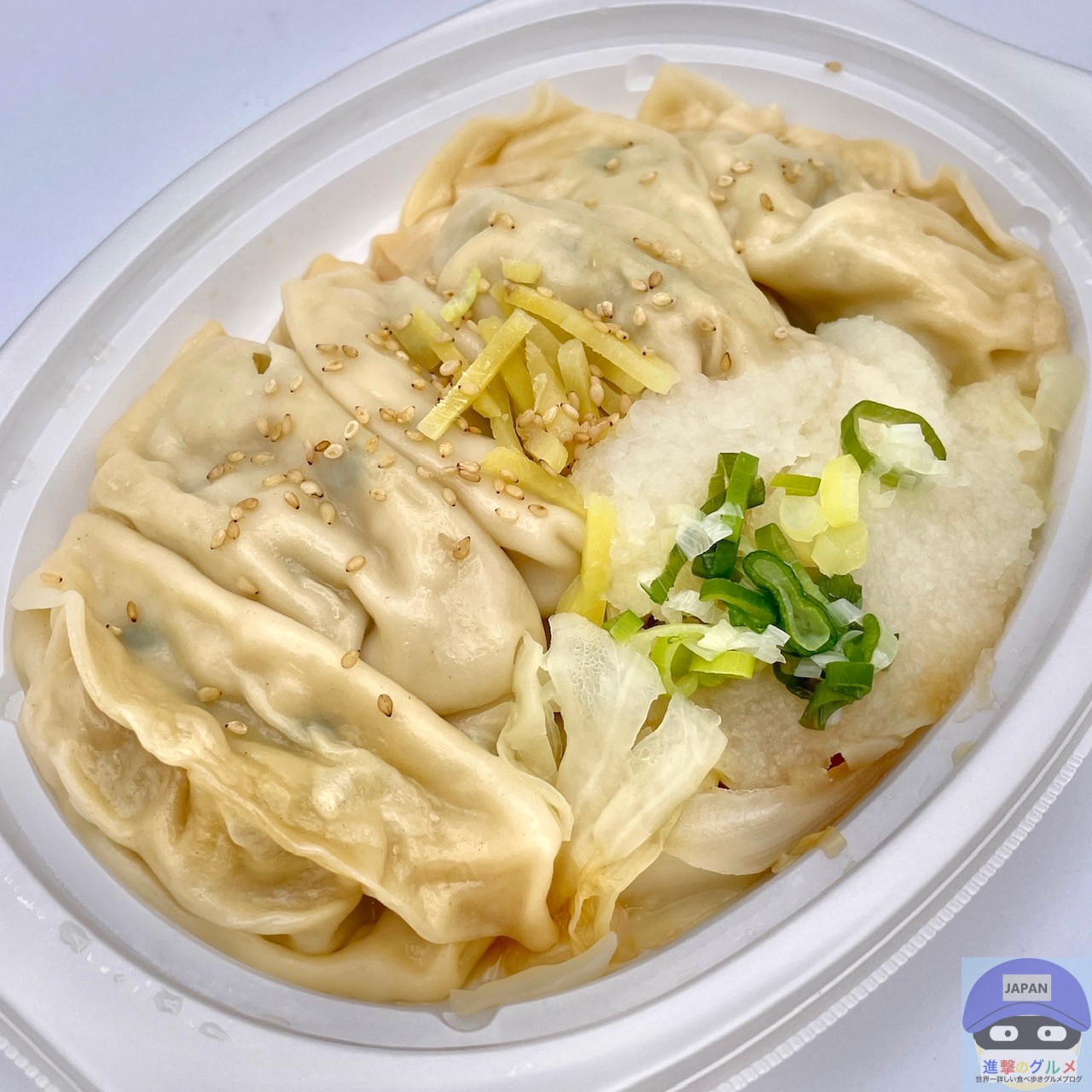 水餃子6個、キャベツ、玉ねぎ、大根おろし、長ねぎ、生姜、ごまが盛られた魅力的な見た目です。