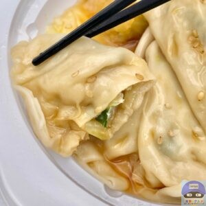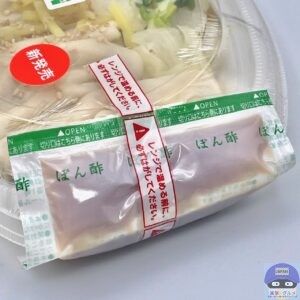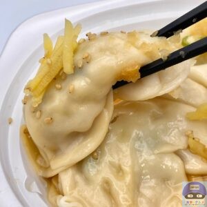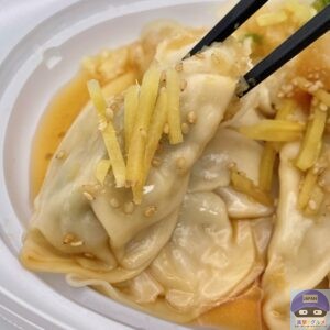 ポン酢小袋をはがし、電子レンジで温めて開封すると、水餃子と生姜の香りがします。