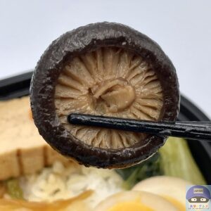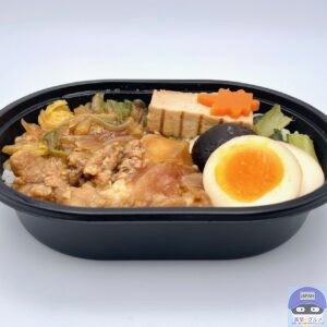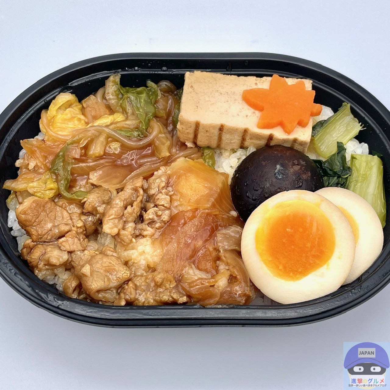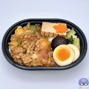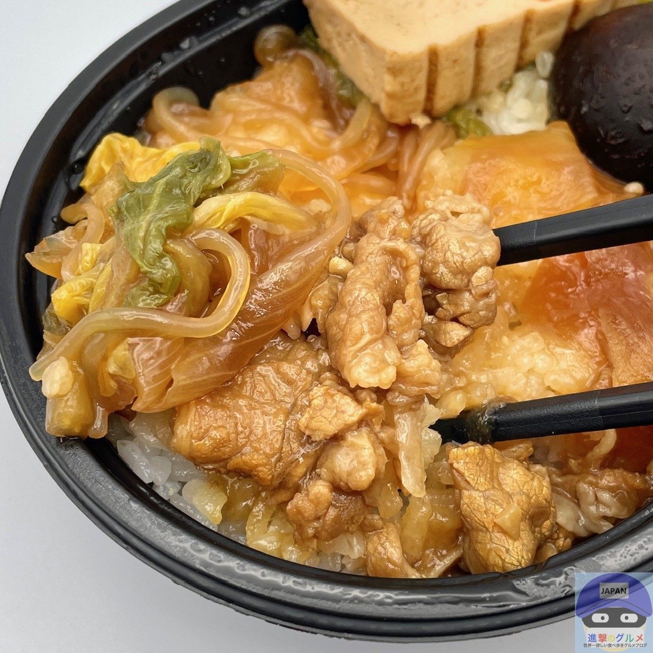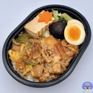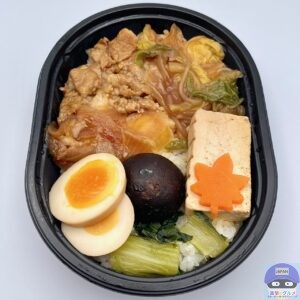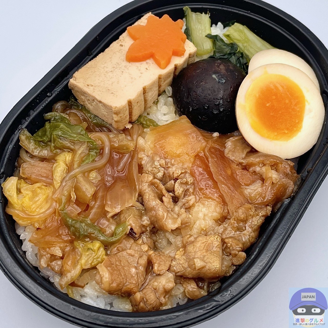 やさしい甘みのタレで煮込んだ牛肉煮と、すき焼きの定番具材(焼き豆腐、椎茸、にんじん、しらたき、白菜)を組み合わせたコンビニ弁当です。