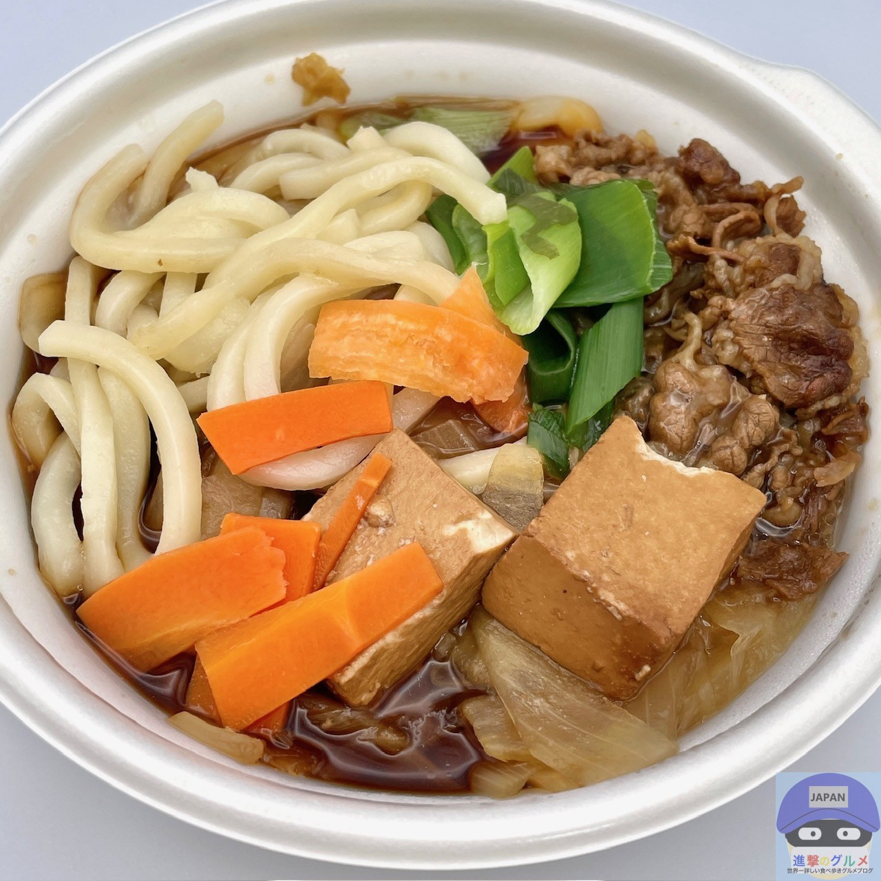 具材は、牛肉、うどん、豆腐、白菜、にんじん、玉ねぎ、ねぎなどが入っています。