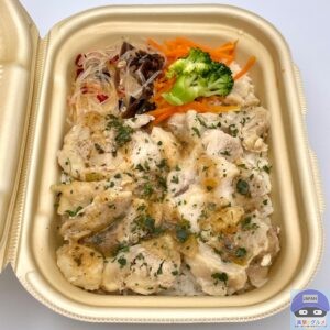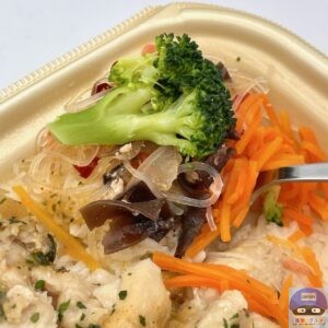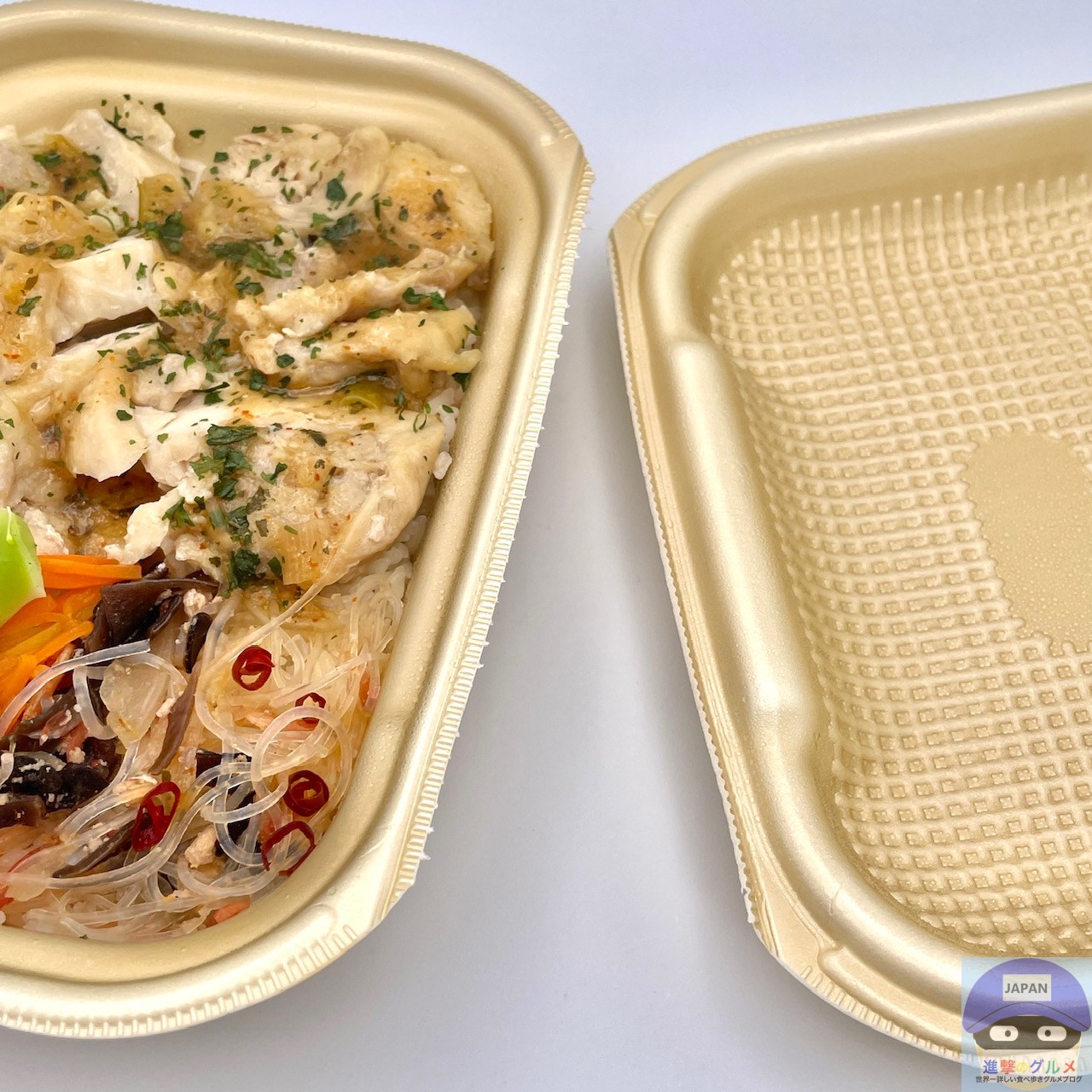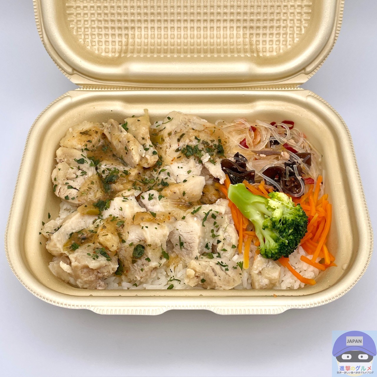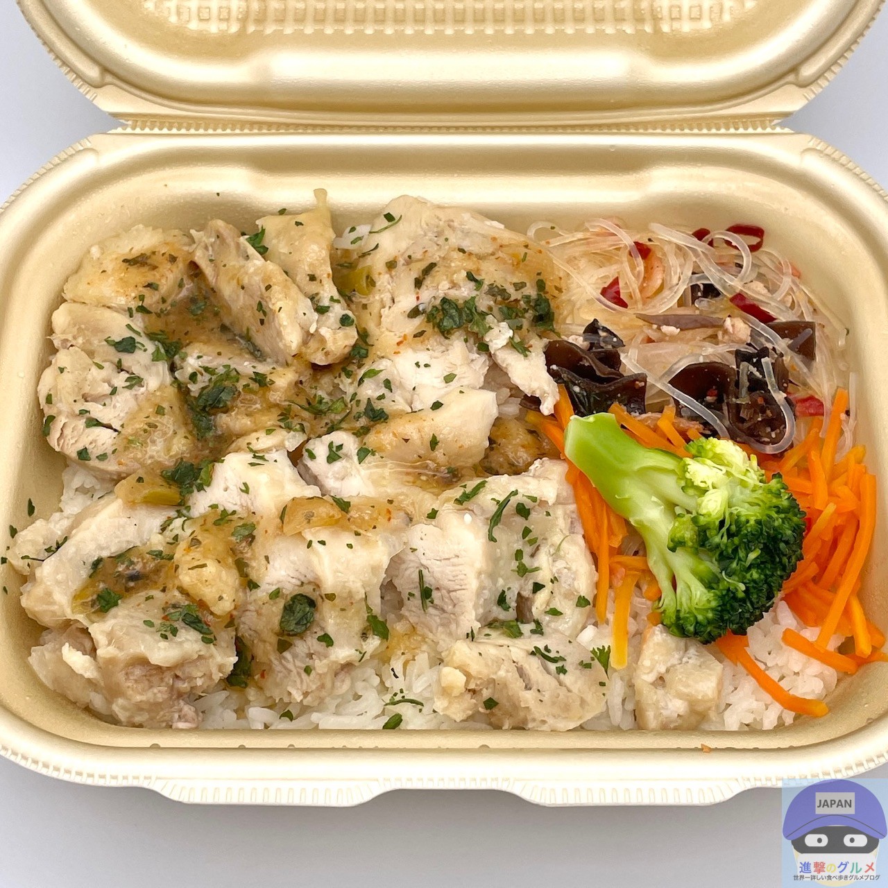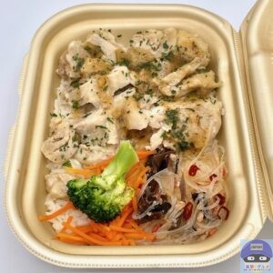 ジャスミンライス、鶏肉、香味ソース、パッタイ風春雨などを組み合わせたランチボックスです。