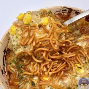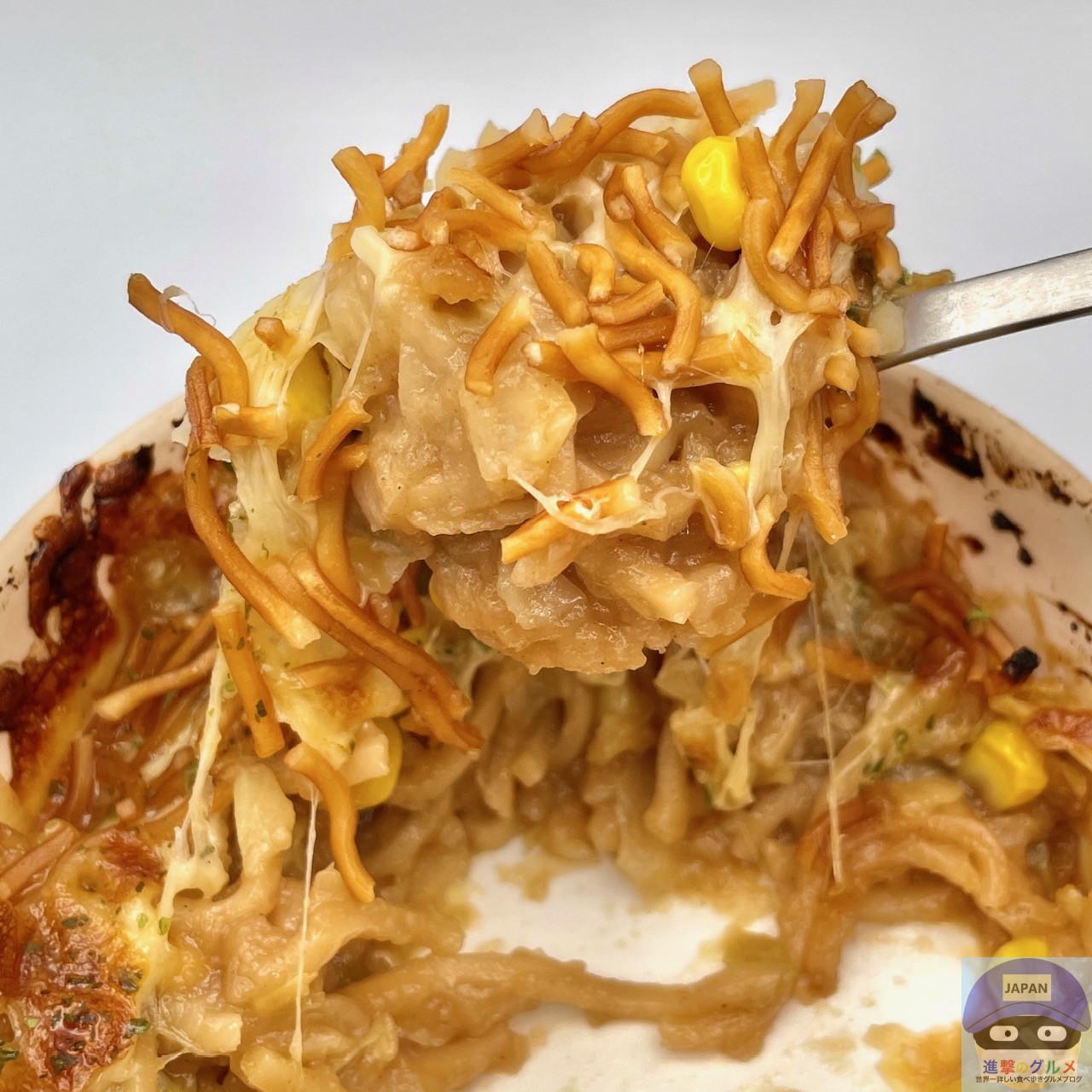 チーズが伸びてシャキシャキしたキャベツとコーンの甘み、ベビースターの香ばしさを感じ、ソースの旨みの効いたもんじゃ焼きの味わいです。
