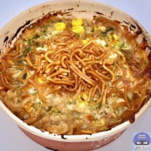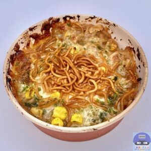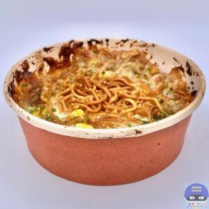 もんじゃのベースの懐かしい味わいや少し強めの塩気に、容器の周りのこんがり焼けた一部は、おこげのような香ばしさもあります。
