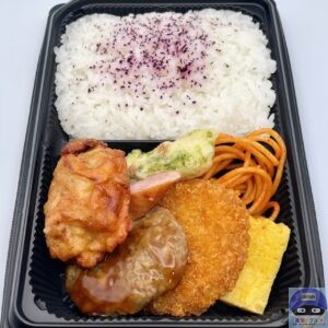 唐揚げ、鶏つくね、コロッケなど人気のおかずを盛りつけた定番の幕の内弁当です。