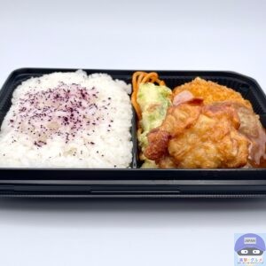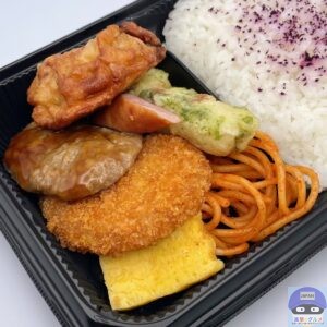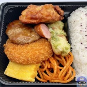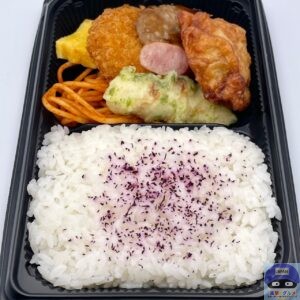 赤しそふりかけを少しかけたご飯、唐揚げ、鶏つくね、コロッケ、ちくわ磯辺天、スパゲッティ、厚焼き玉子、ソーセージが盛られています。
