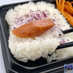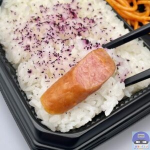 赤しそふりかけが少しだけかかったご飯に、ソーセージが合います。