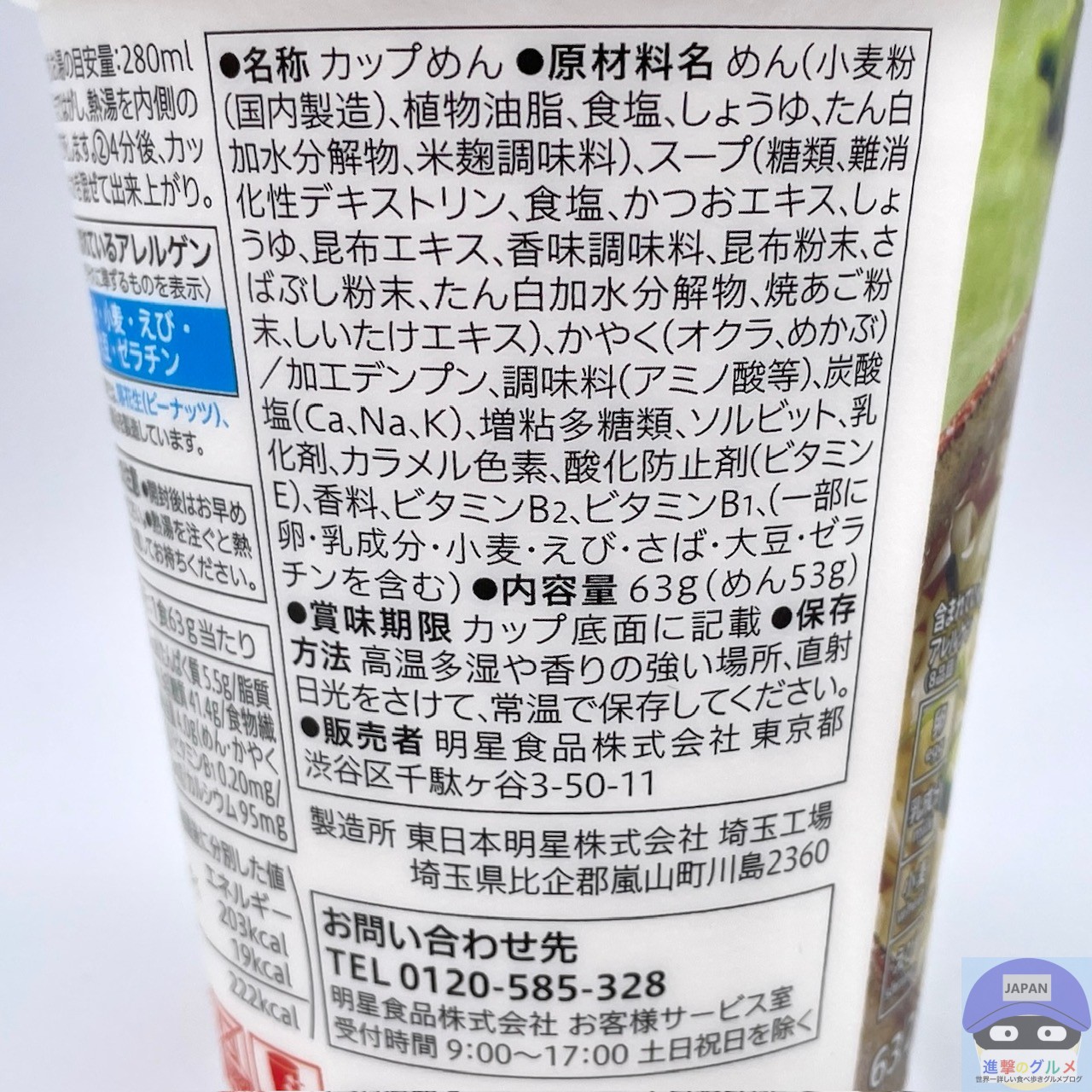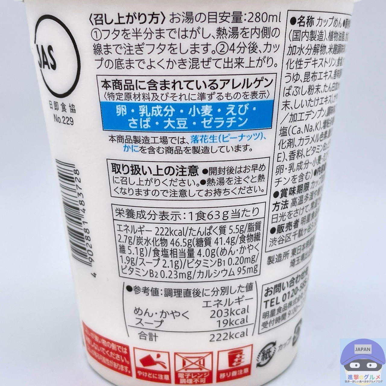内容量は63g(めん53g)、カロリーは222kcalです。