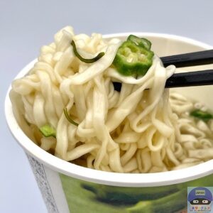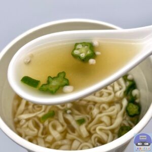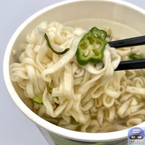 つるりとした食感のノンフライうどんに、おくらとめかぶが入った、だしの旨みをしっかりきかせた鰹と昆布だしのカップうどんです。