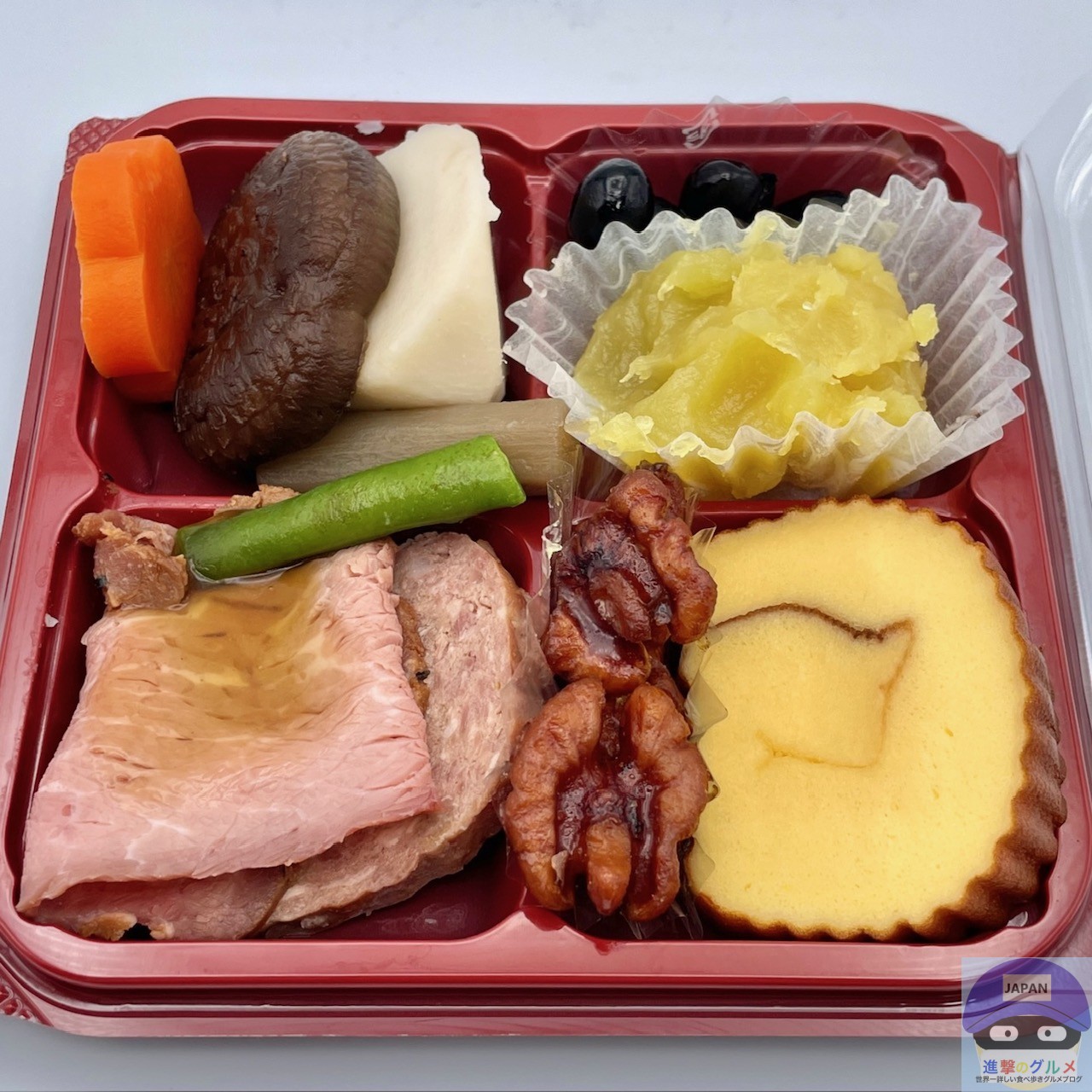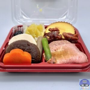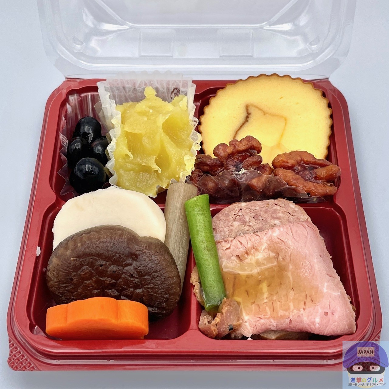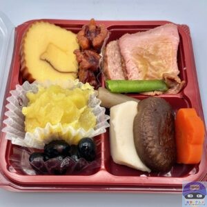 ローストビーフ(ローストビーフソース付き)、パテ・ド・カンパーニュ、煮物(椎茸、里芋、人参、ごぼう、いんげん)、砂糖がけくるみ、伊達巻、丹波篠山産黒豆、栗きんとん(鹿児島県産べにはるか使用)の組み合わせです。