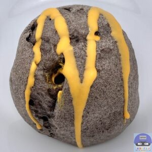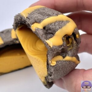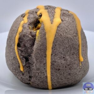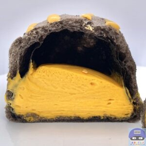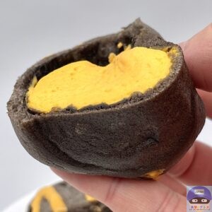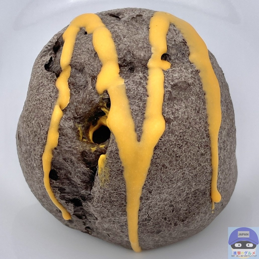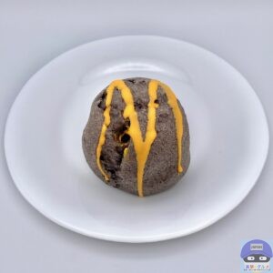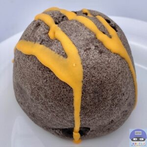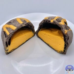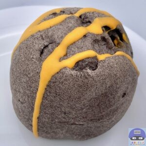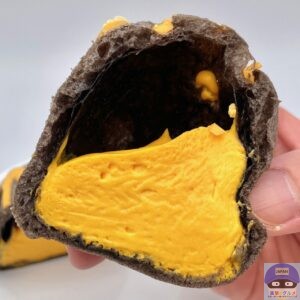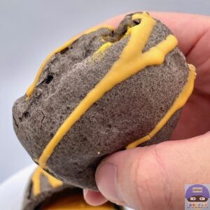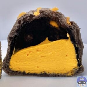 黒色のシュー生地にオレンジ色のチョコを線掛けした、魅力的な見た目のシュークリームです。