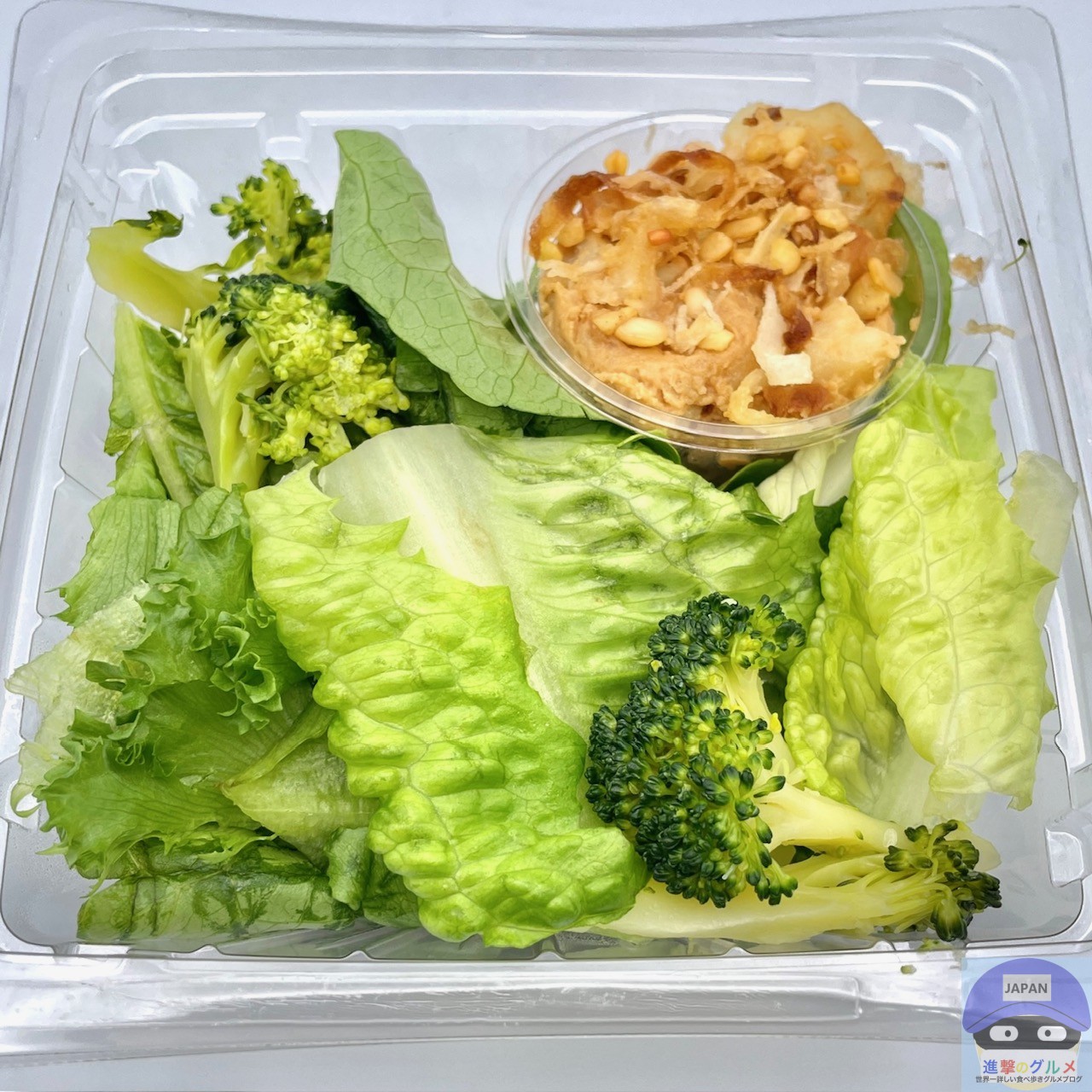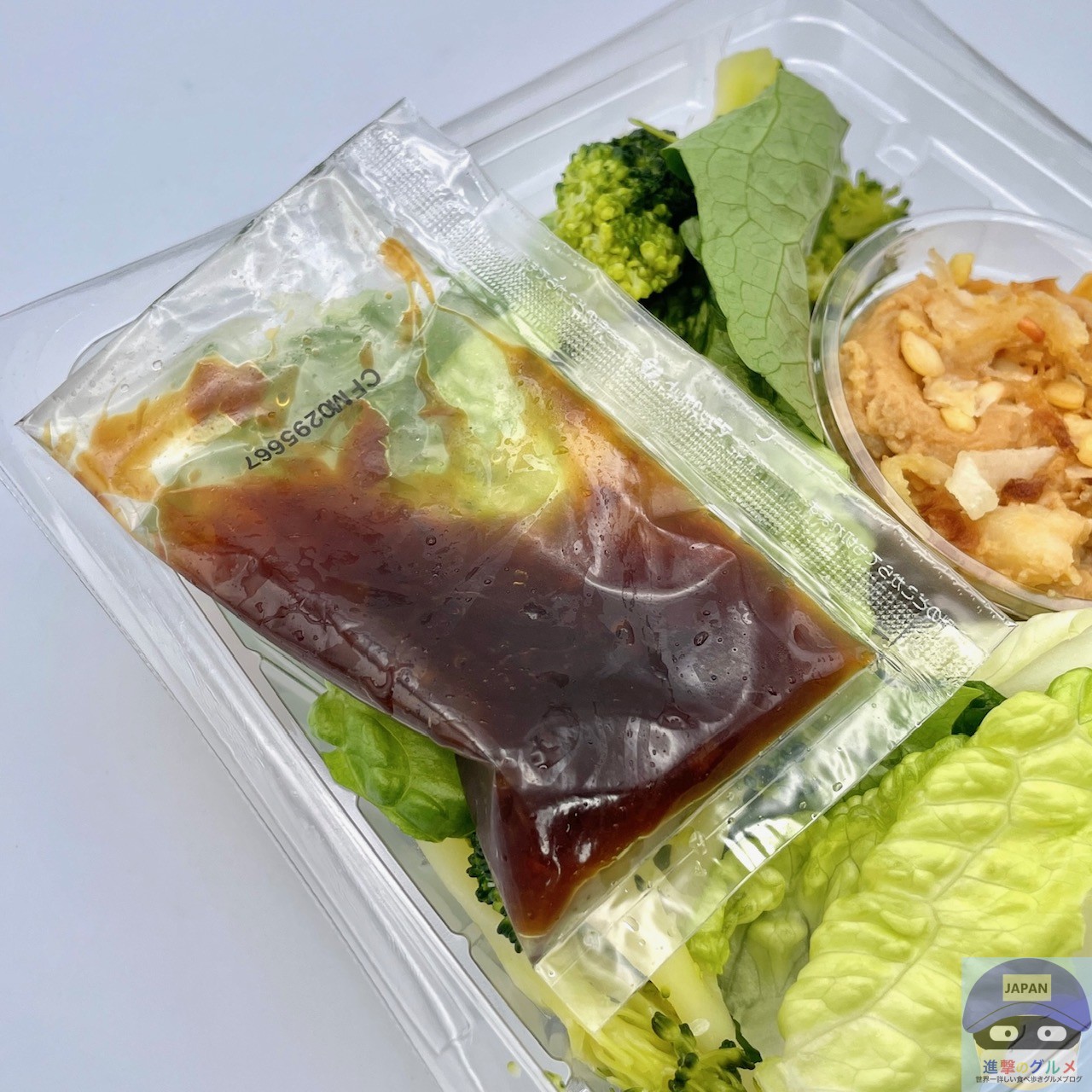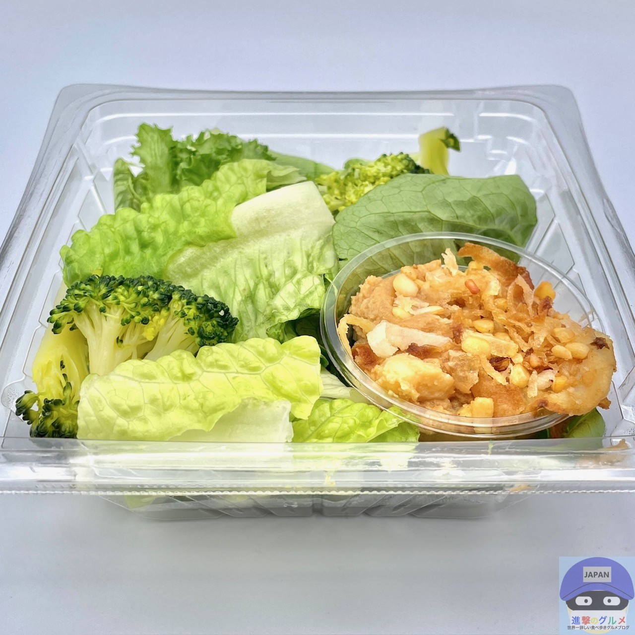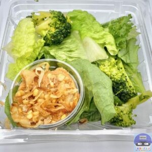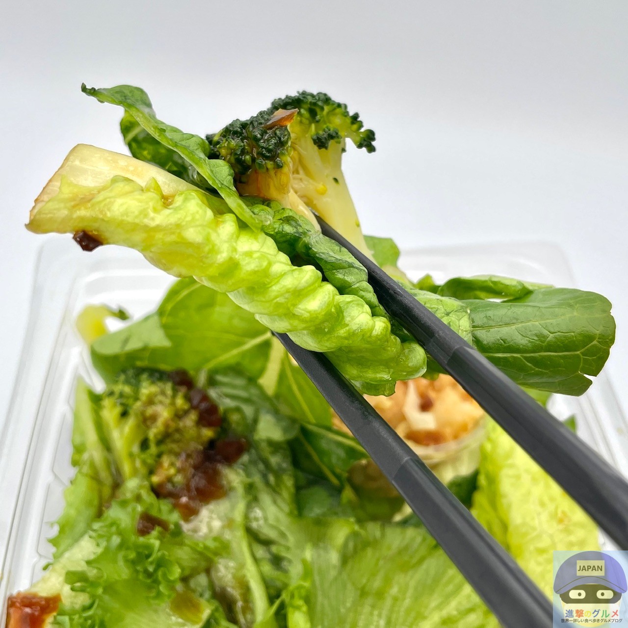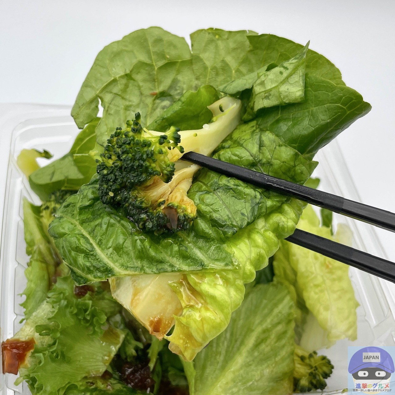 ロメインレタスとフリルレタスがフレッシュでシャキシャキ食感、ブロッコリーの食感も良く、和風玉ねぎドレッシングの酸味と玉ねぎの甘みがサラダと相性抜群です。