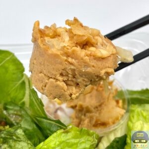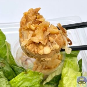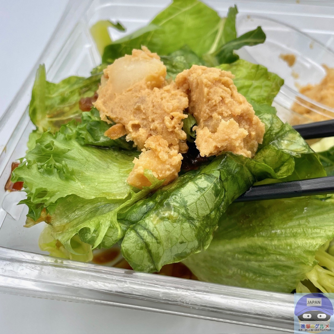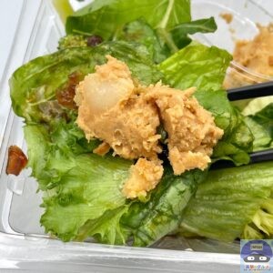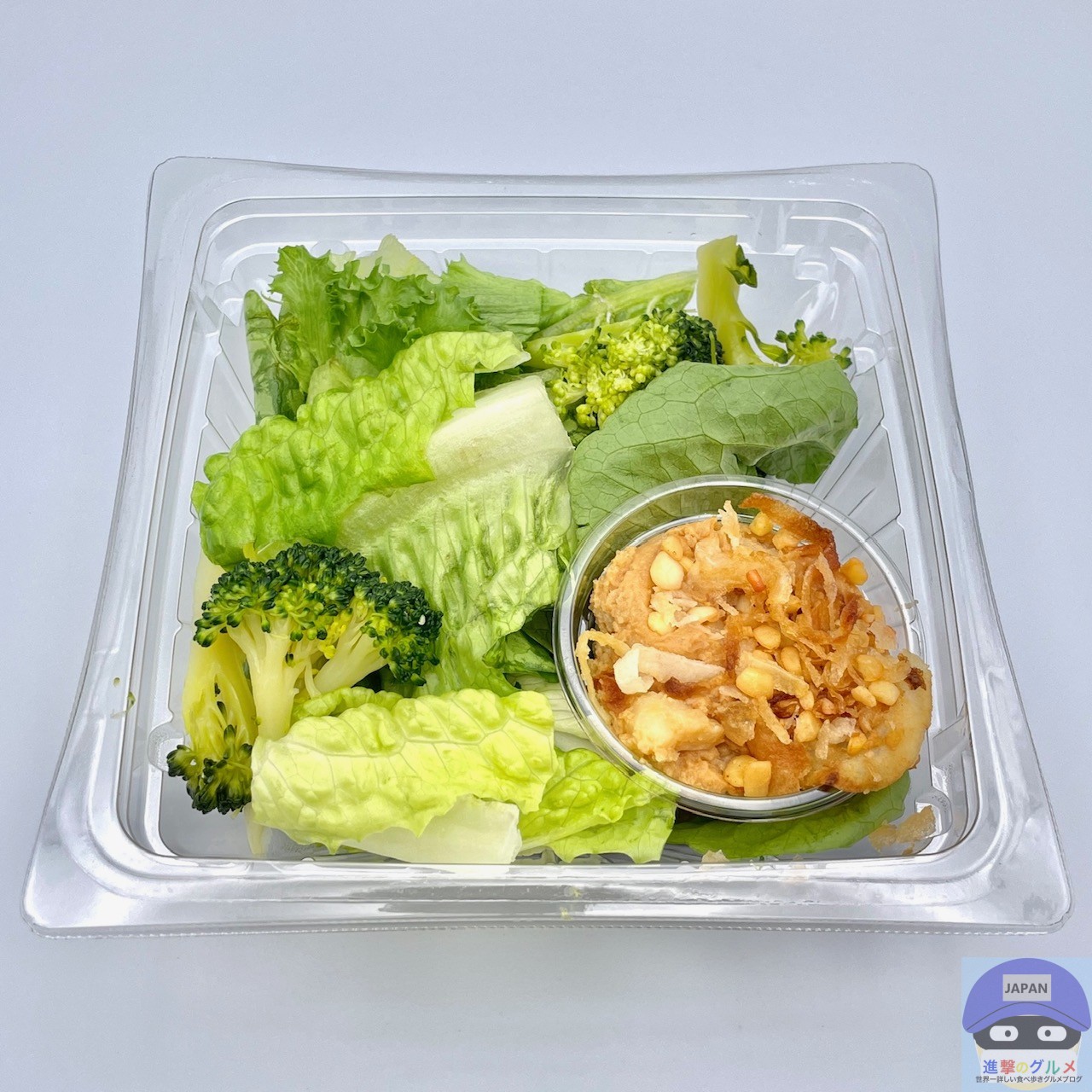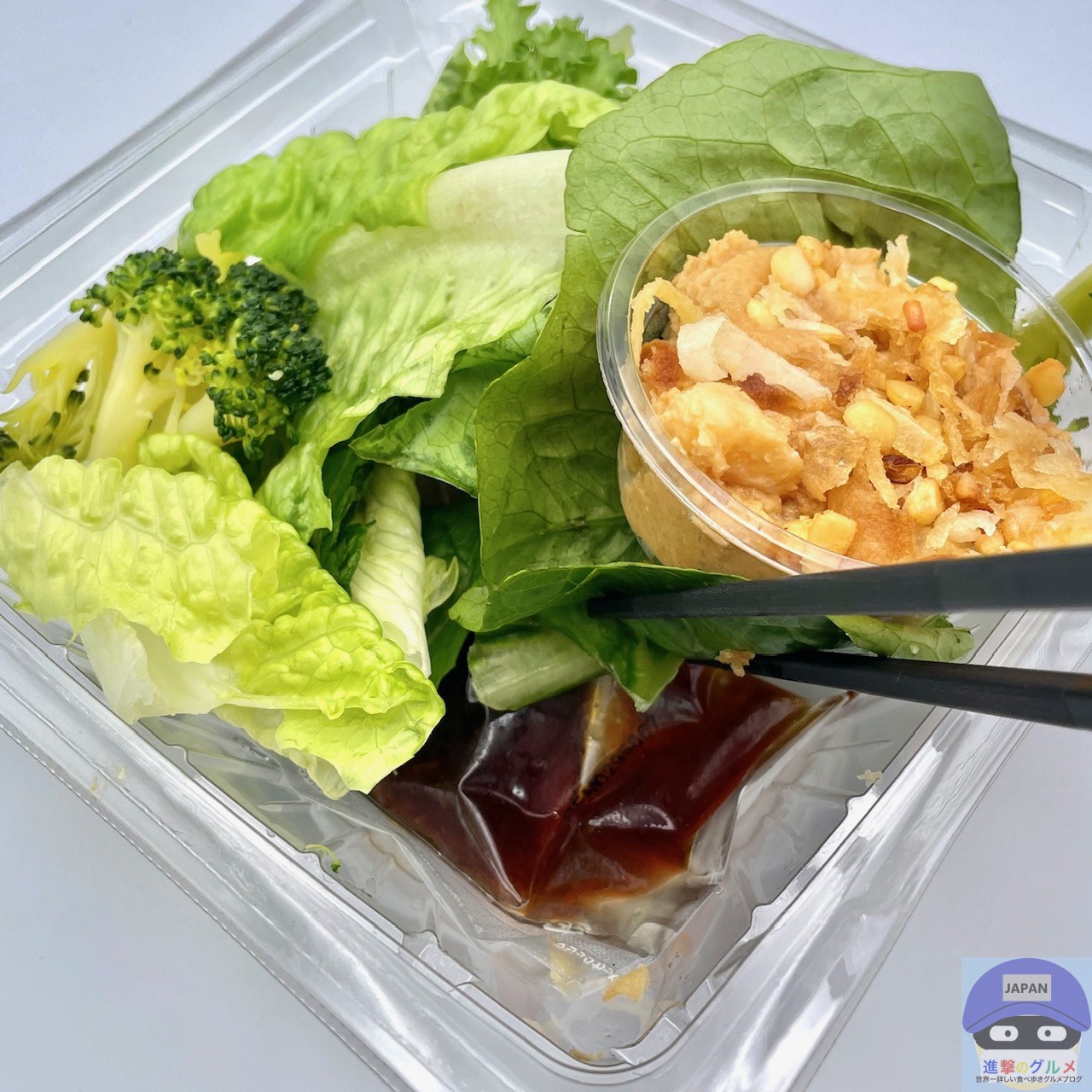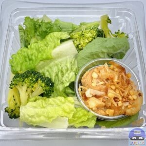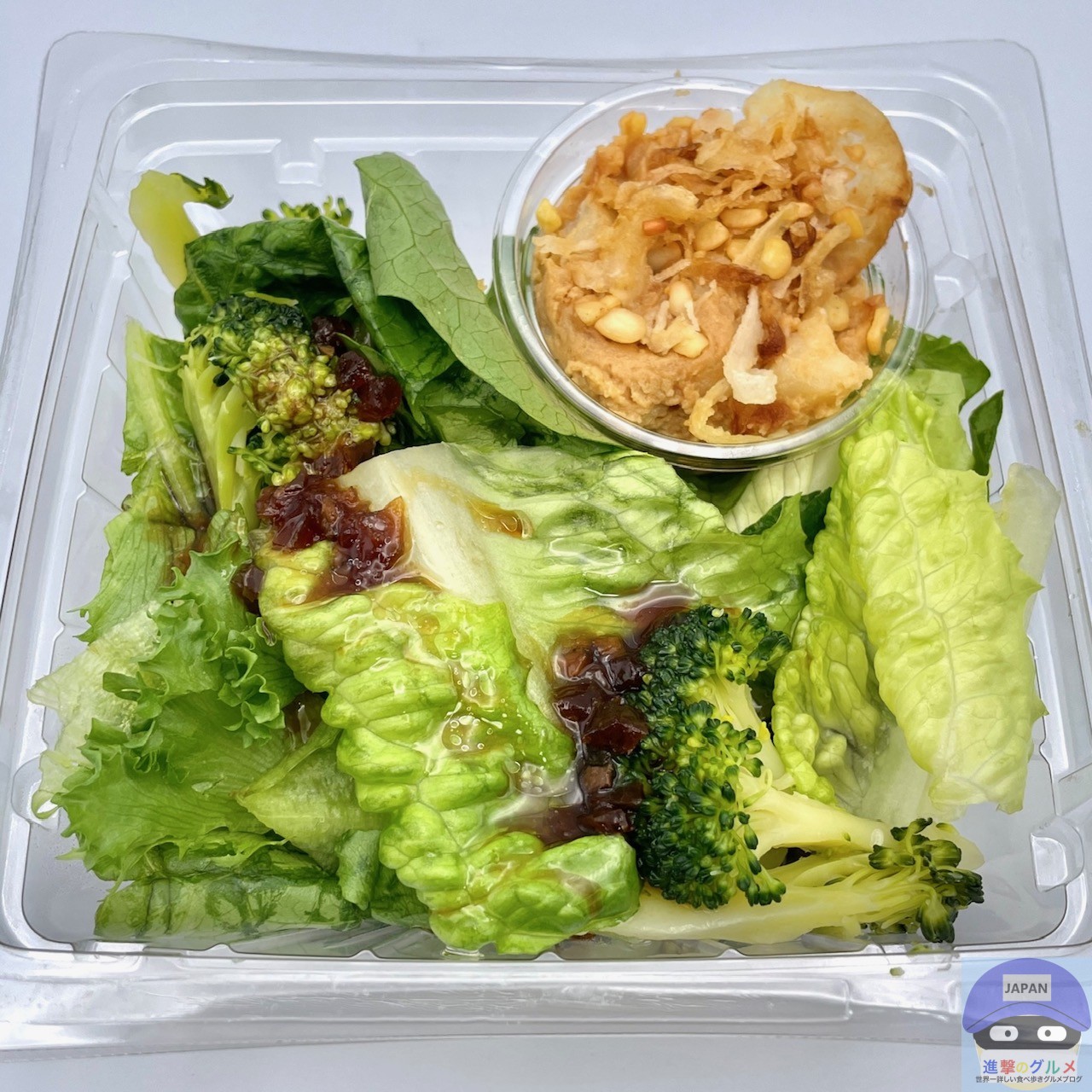 ロメインレタスとフリルレタスがフレッシュでシャキシャキ食感、ブロッコリーの食感も良く、和風玉ねぎドレッシングの酸味と玉ねぎの甘みがサラダと相性抜群です。