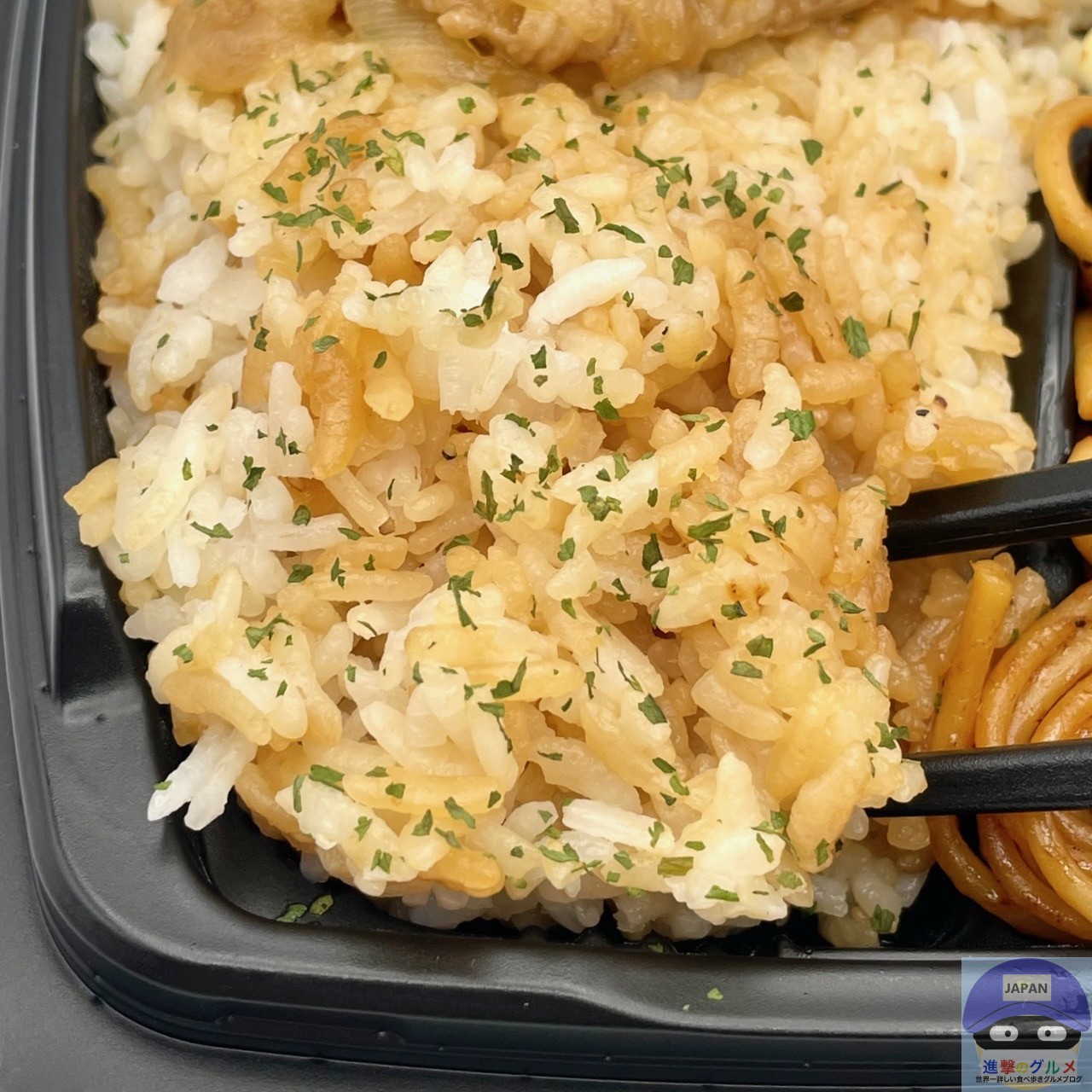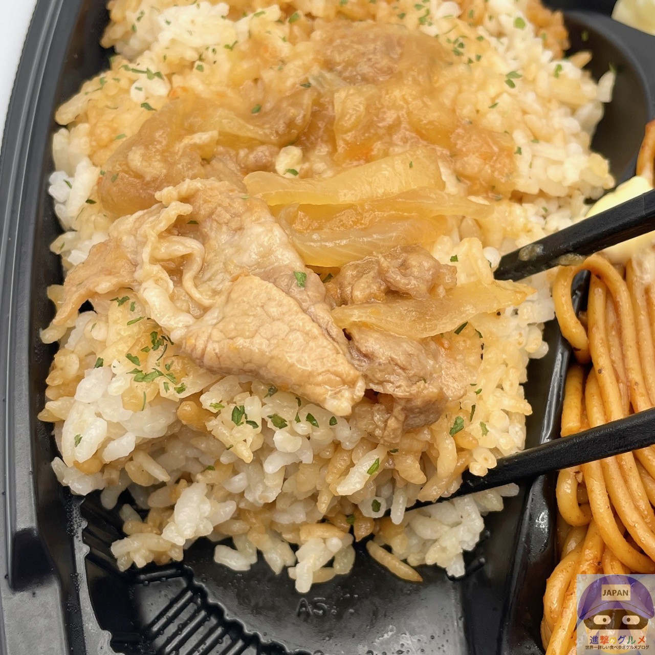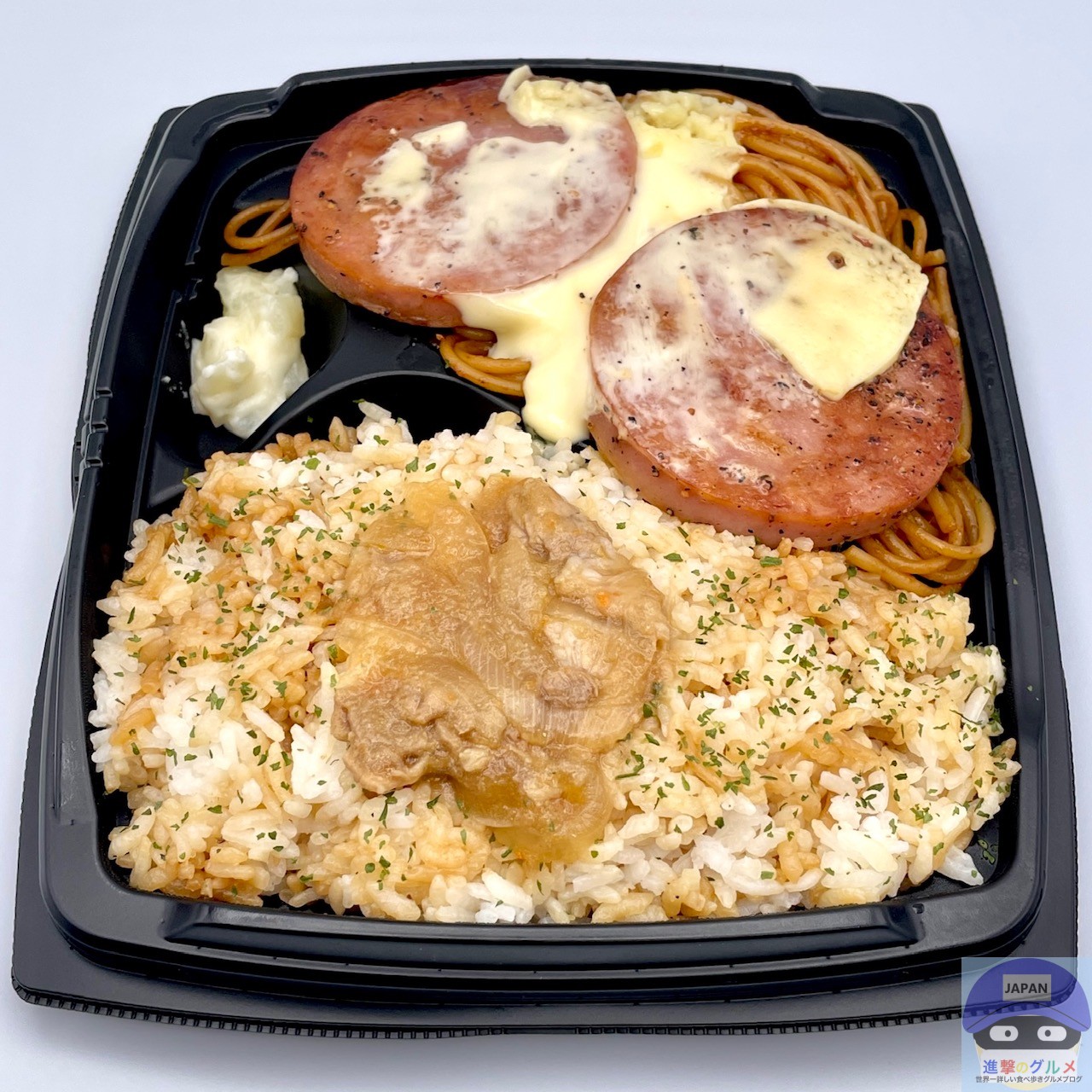 にんにく醤油だれがかかったご飯に、ソーセージステーキと生姜焼き、ソース味の焼きスパゲッティを組み合わせた、満足感のある大盛り弁当です。