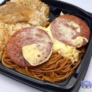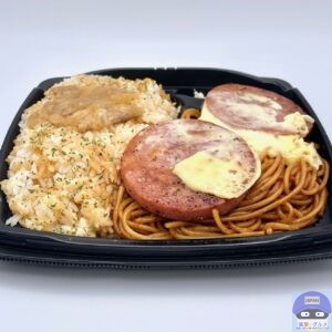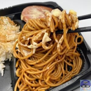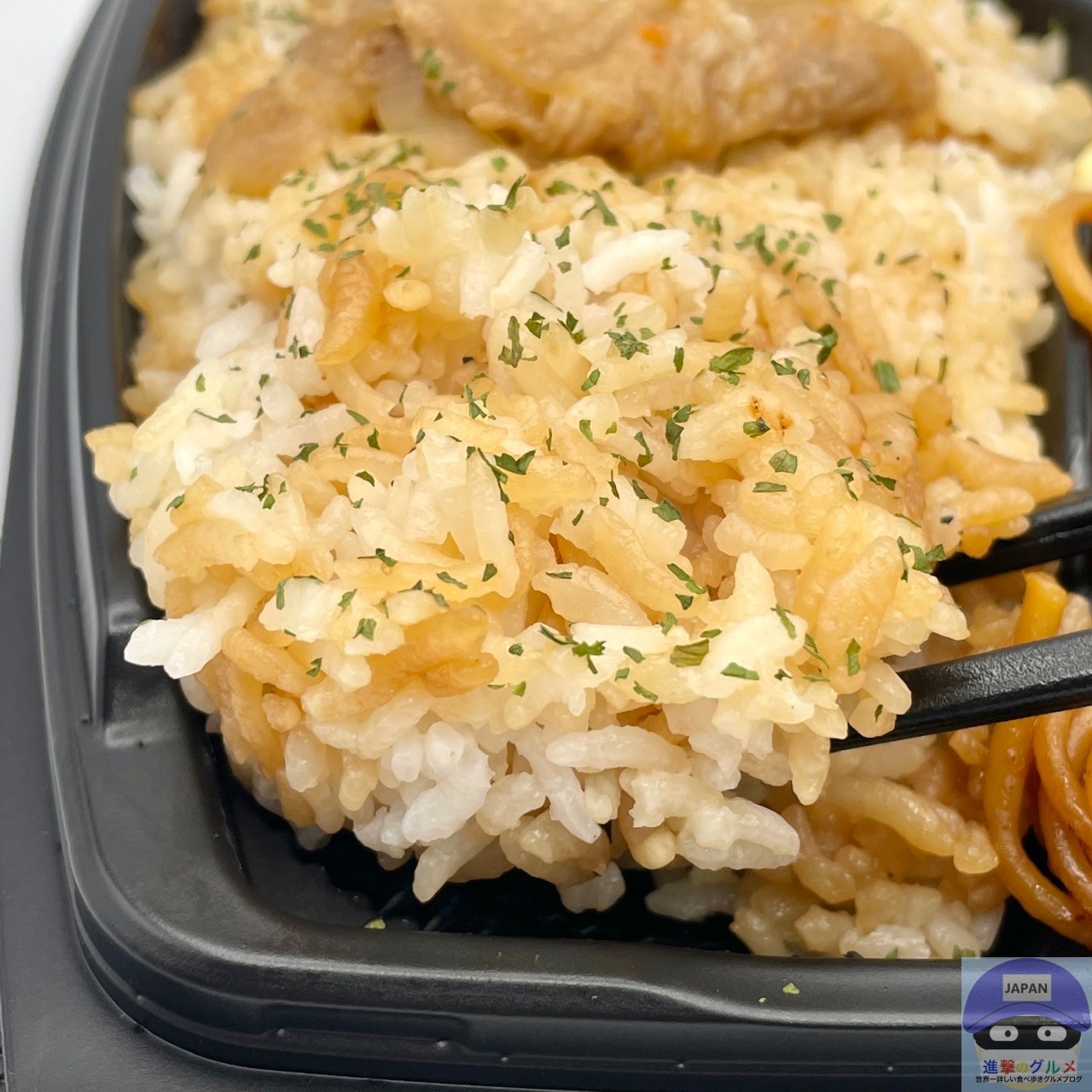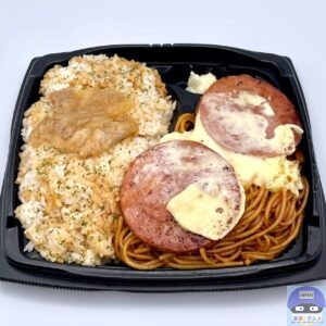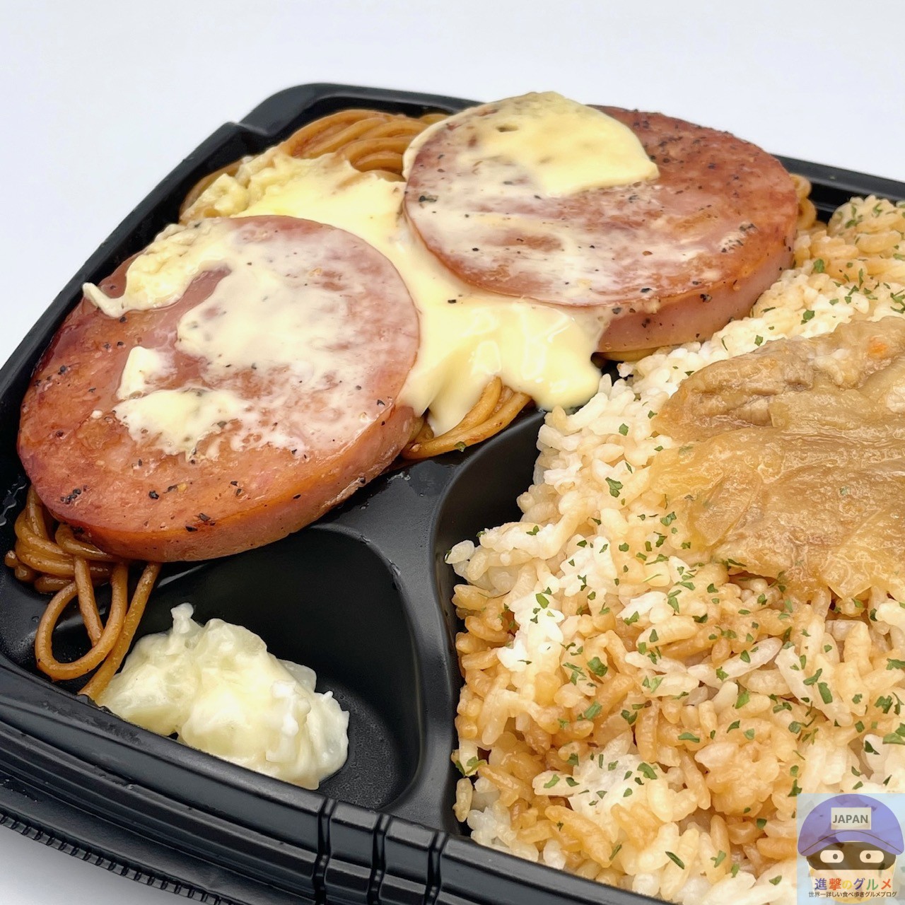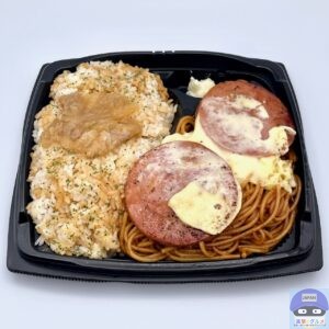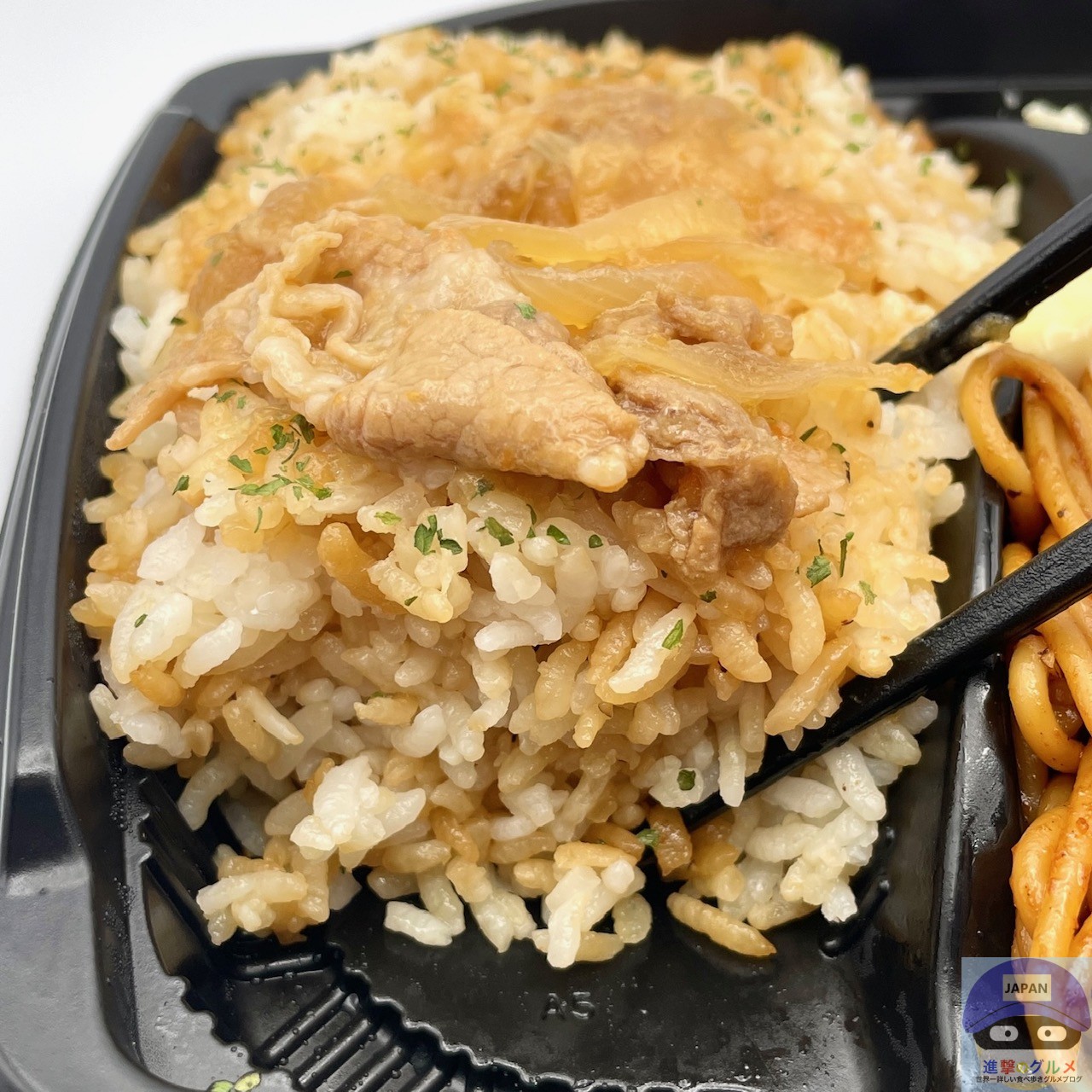 にんにく醤油だれがかかったご飯に、ソーセージステーキと生姜焼き、ソース味の焼きスパゲッティを組み合わせた、満足感のある大盛り弁当です。
