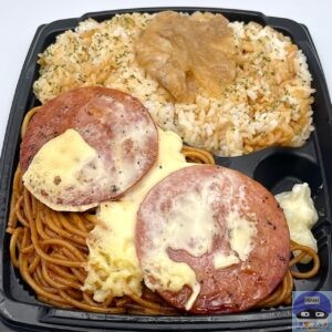 にんにく醤油だれがかかったご飯(豪州産)、生姜焼き、ソーセージステーキ2枚、ソース味の焼きスパゲッティ、からしマヨネーズ、ポテトサラダが盛られています。