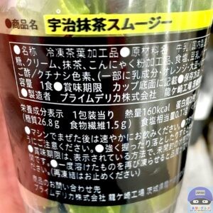 牛乳(国内製造)、砂糖、クリーム、抹茶、こんにゃく粉加工品、豆乳、食物繊維などが入って、カロリーは160kcalです。