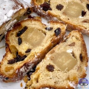 バターを使用した生地に、レーズン、パイン砂糖漬け、オレンジピール砂糖漬け、りんご砂糖漬け、ローマジパン(マジパンペースト)、アーモンド、砂糖、粉糖などを合わせています。