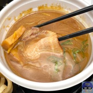 個人的に、スープと極太メンマだけが少しおいしい、全体としては、セブンイレブンの「とみ田監修 つけ麺」が最もおいしかった3年前と比べると、2ランクくらい味やクオリティが下がっています。