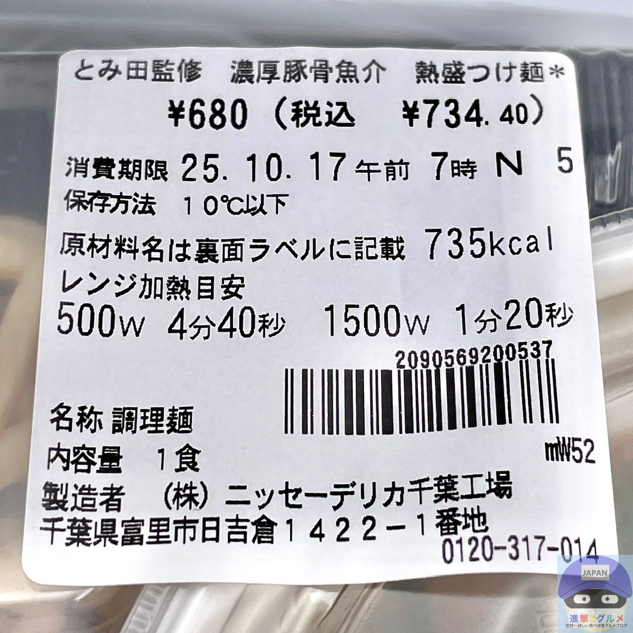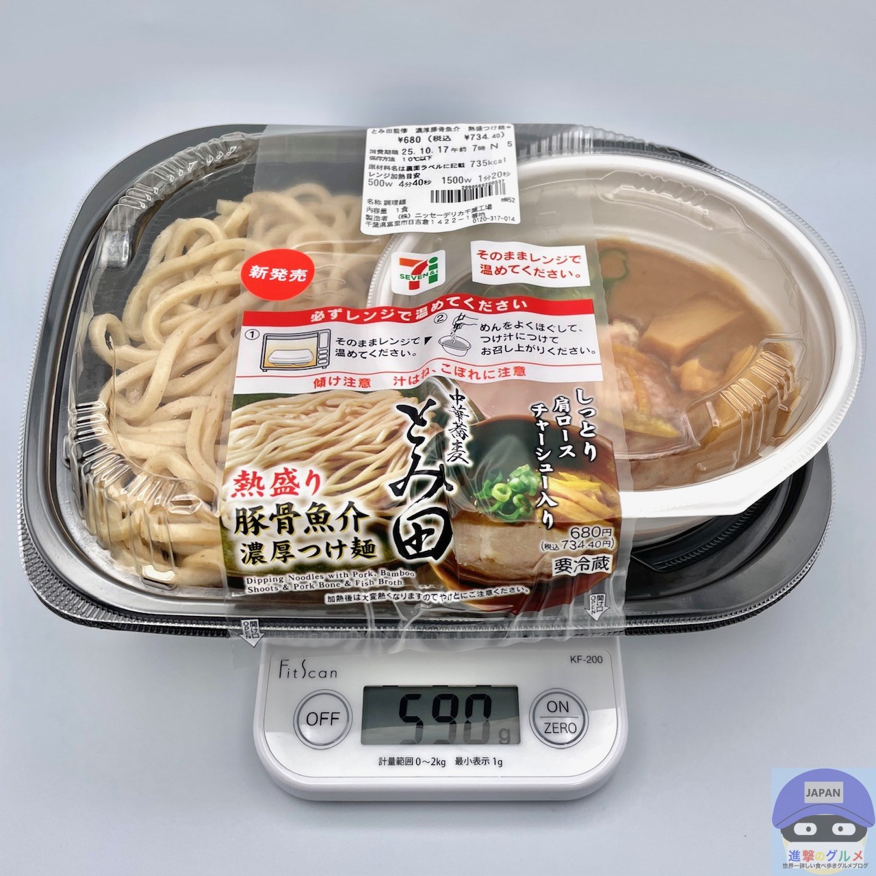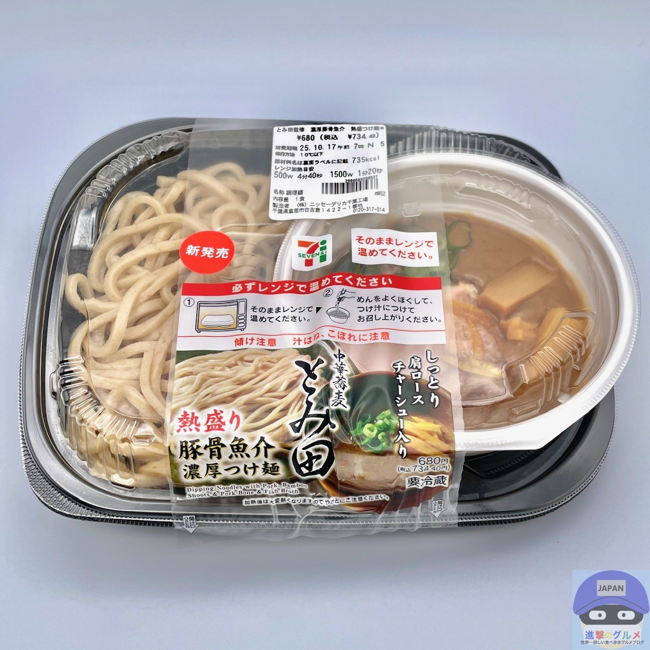 2025年10月15日、セブンイレブンが新作チルド麺「とみ田監修 濃厚豚骨魚介 熱盛つけ麺(734円)」を発売しました。