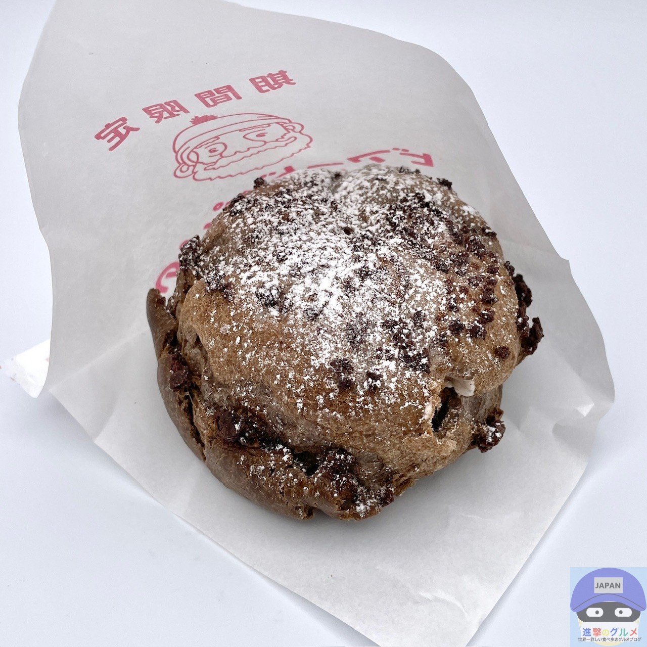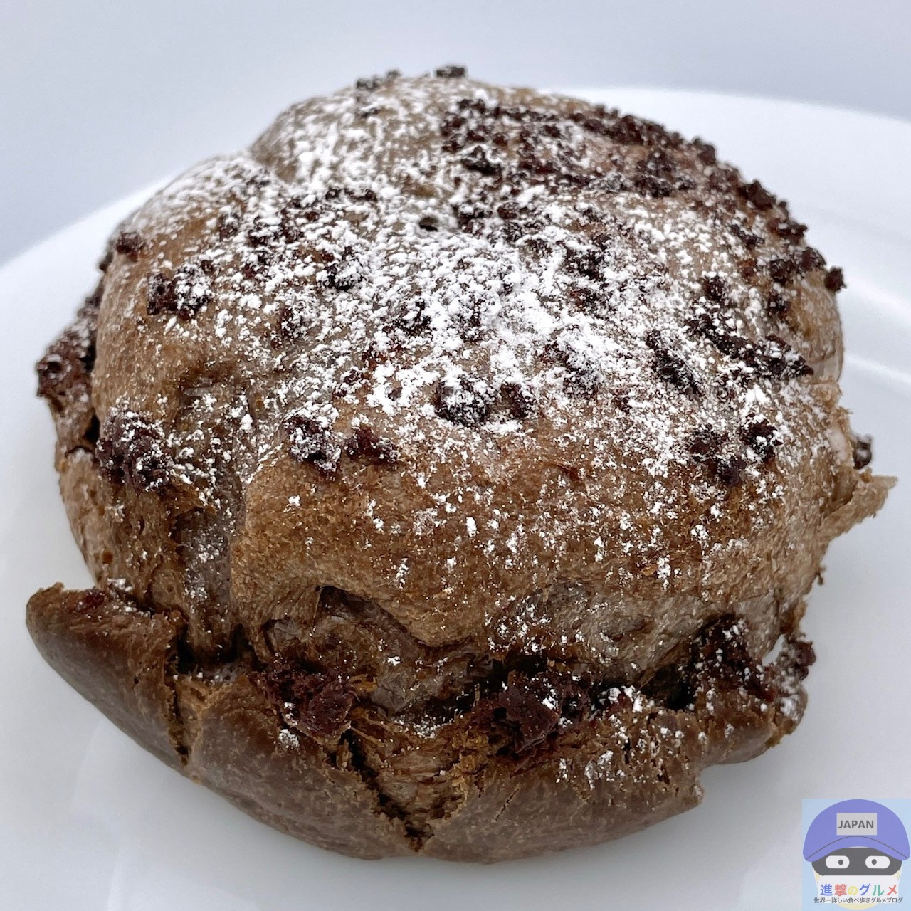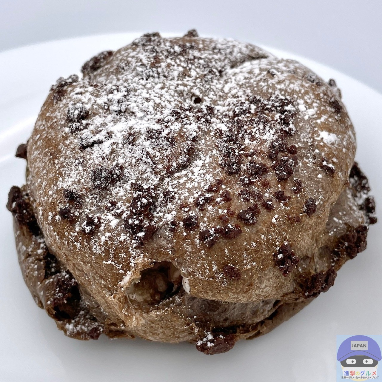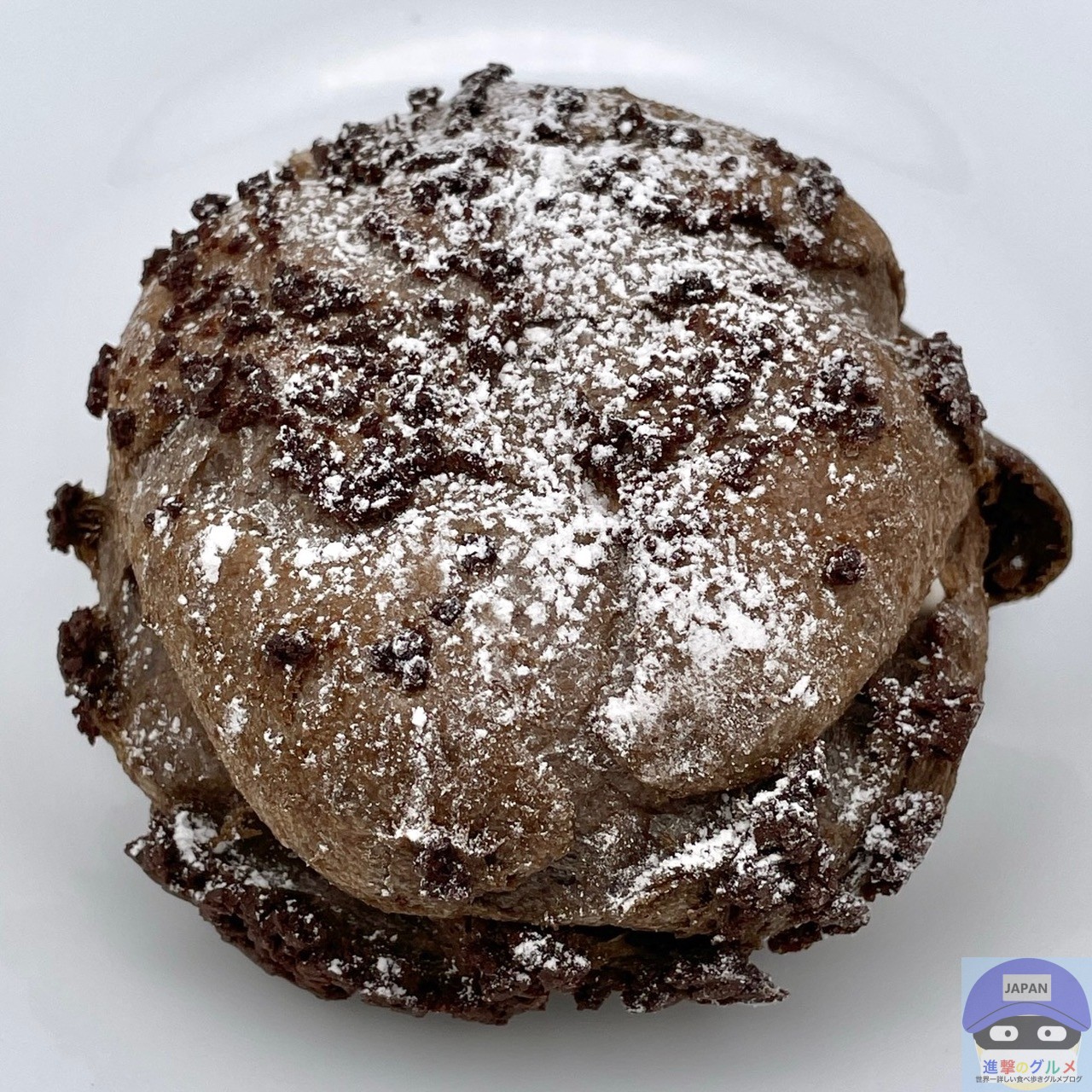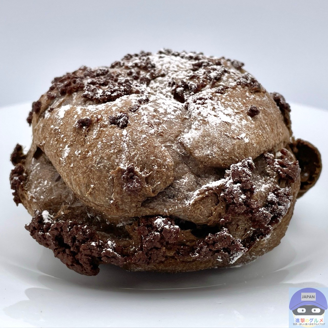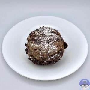 黒いシュー生地を焼き上げ、ショコラクッキーと粉糖をトッピングしたシュークリームです。