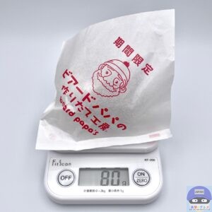 重さをはかると、包装紙を含めて80gでした。