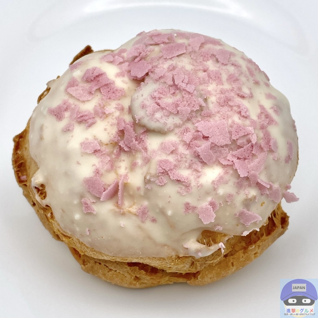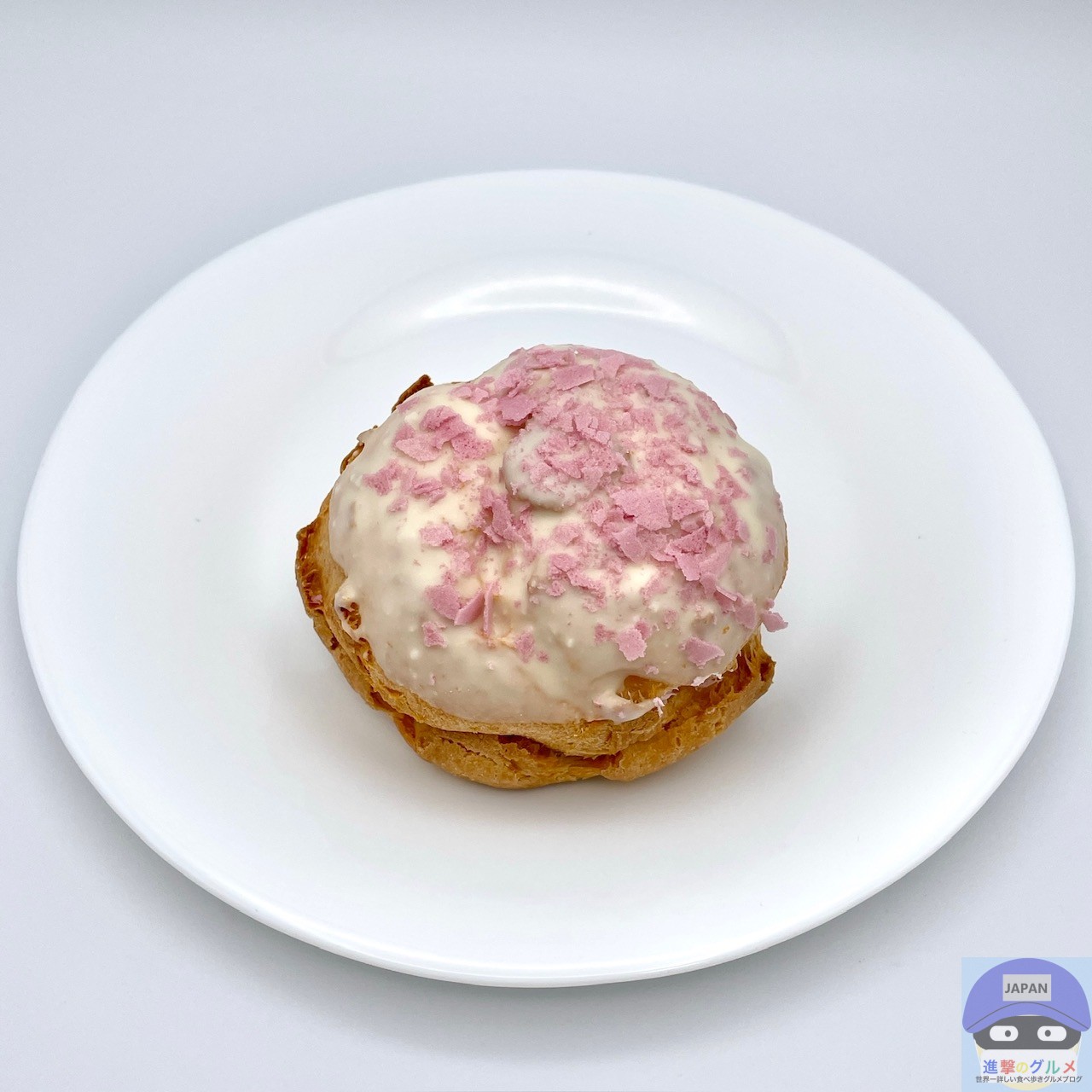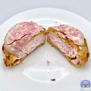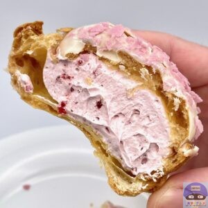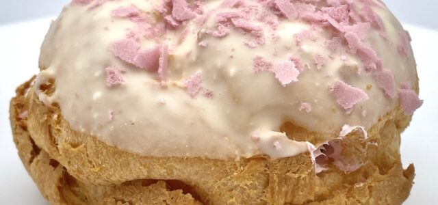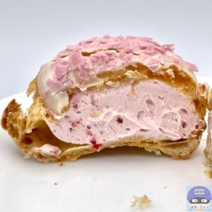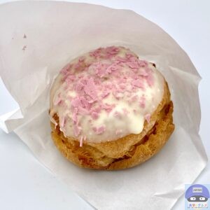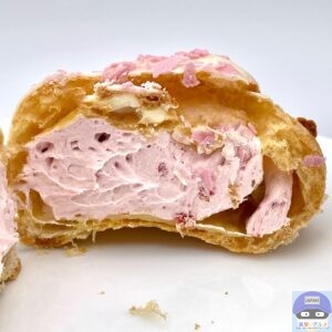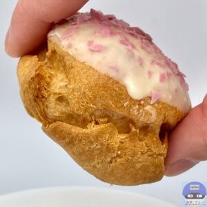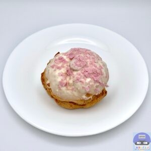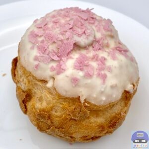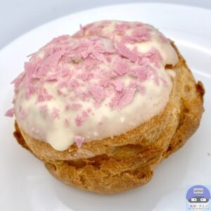 パイシュー生地にホワイトチョコと桜色フレークをトッピングした春らしい魅力的な見た目のシュークリームです。