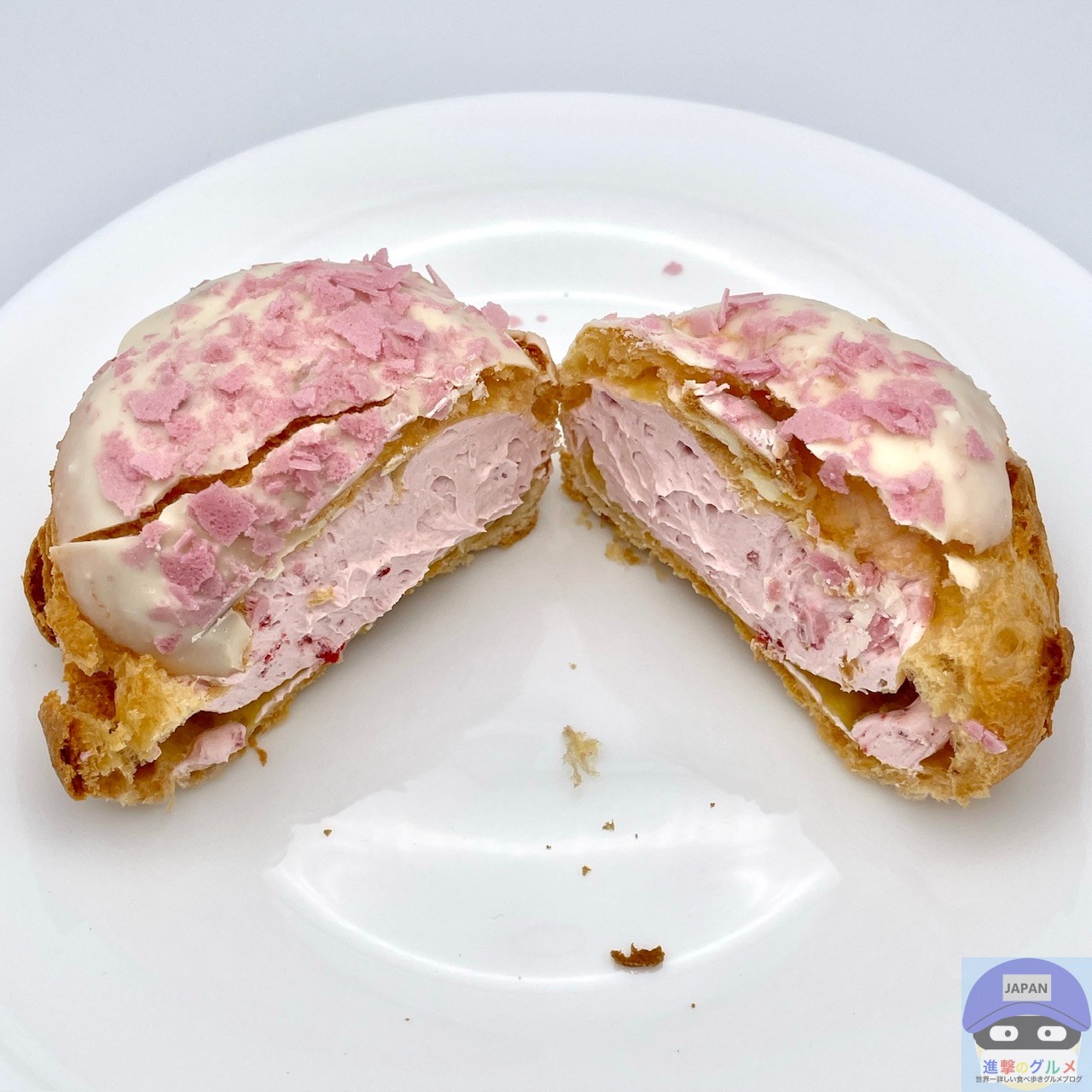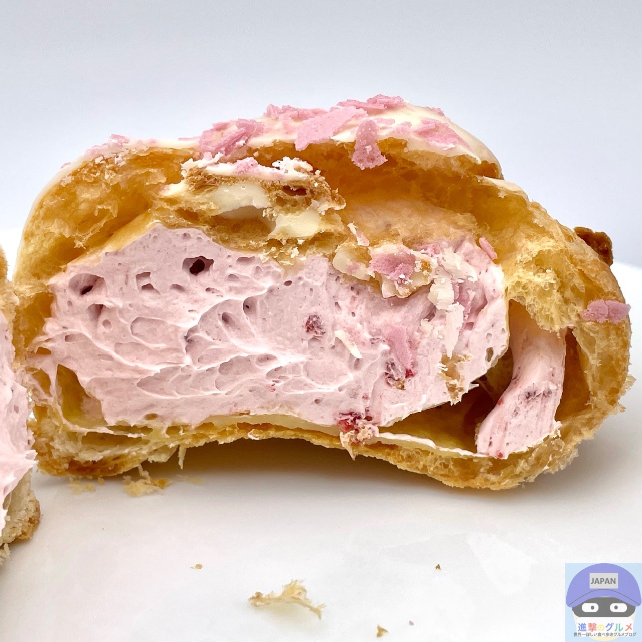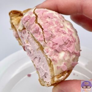 表面サクッとパイシュー生地の香ばしい味わいに、軽いサクサクの桜色フレーク、ミルキーな旨みのホワイトチョコが少しアクセントです。