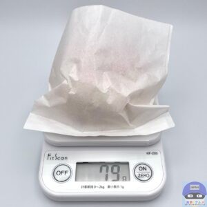 重さをはかると、包装紙を含めて79gでした。