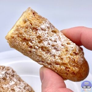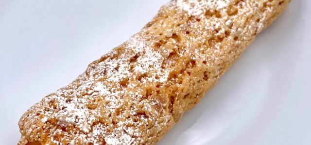 カシューナッツやアーモンドを使用した長細いシュー生地が特徴、ガブッと手軽にザクザク香ばし食感を楽しめるスティック型のシュークリーム、ワンハンドスイーツです。