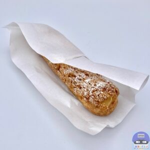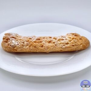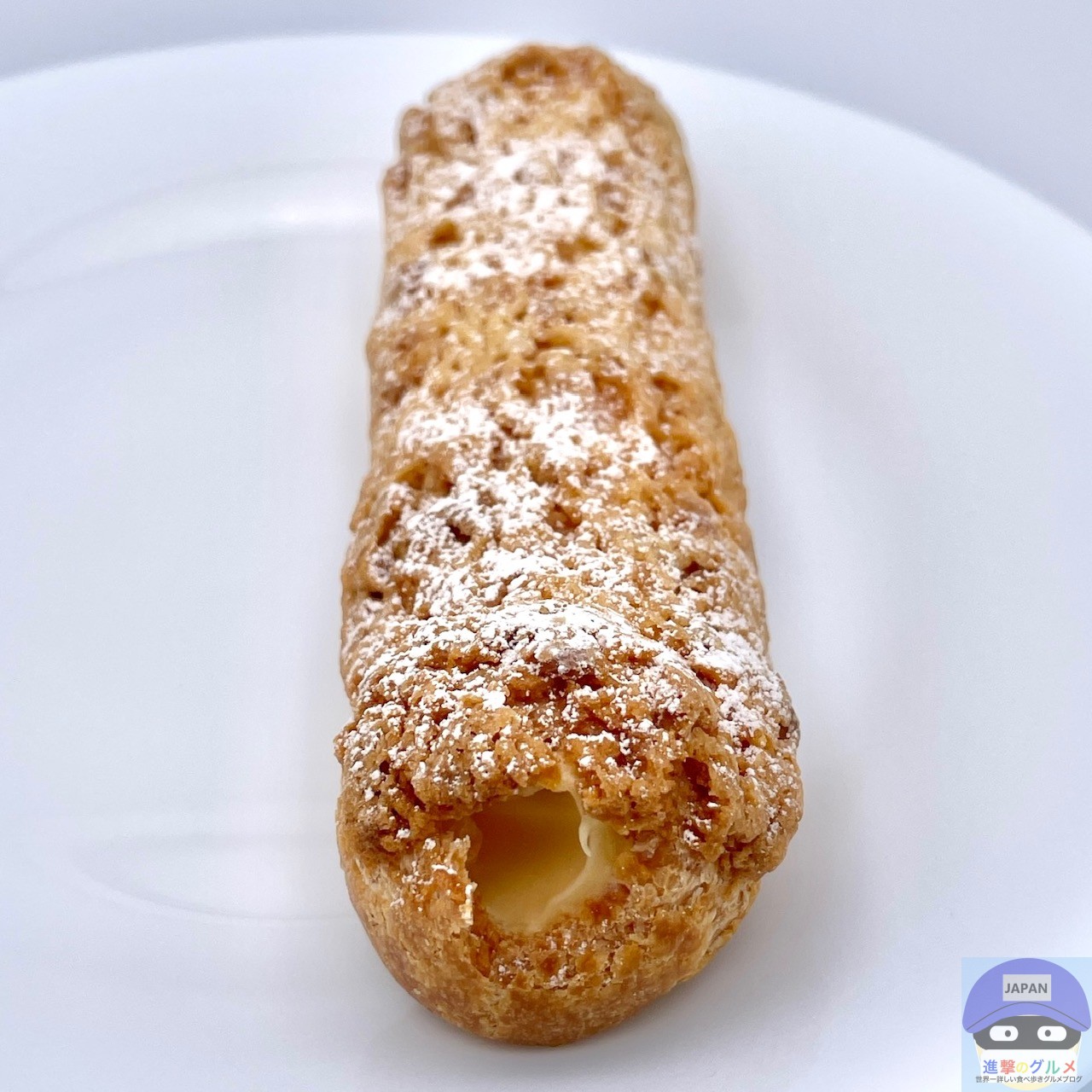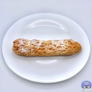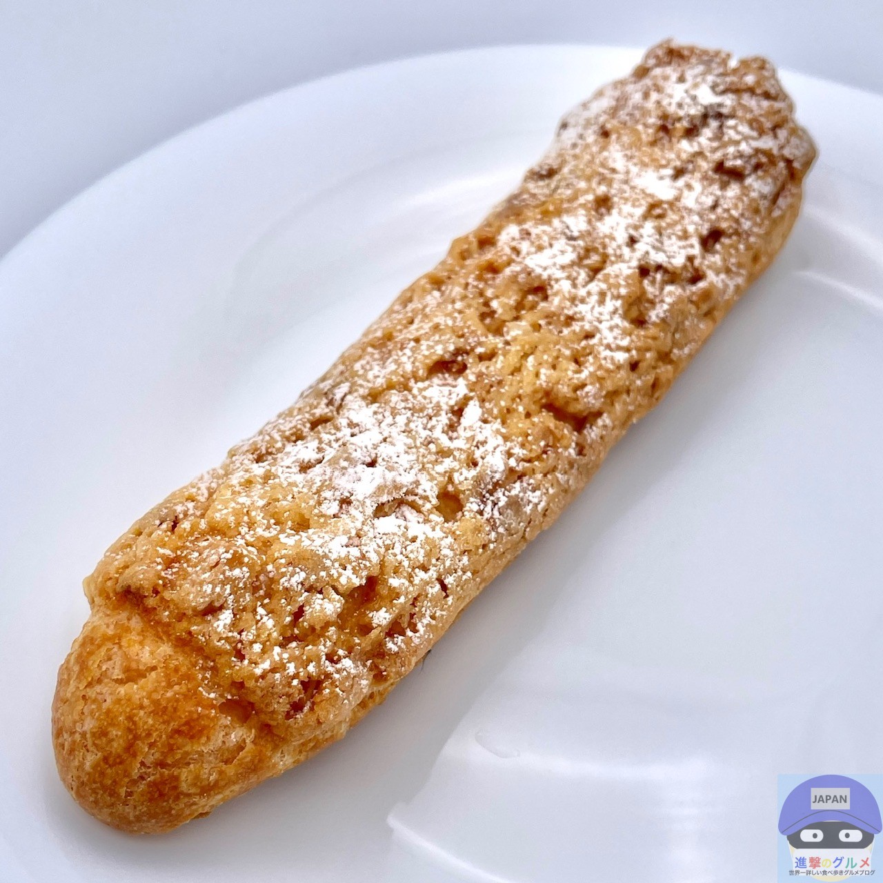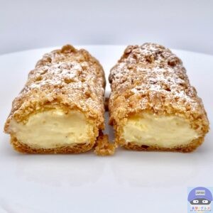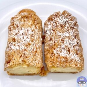 砕いたカシューナッツとアーモンドを表面に混ぜ込んだスティック状のシュー生地に特製カスタードクリームを詰めた、長細いシュークリームです。