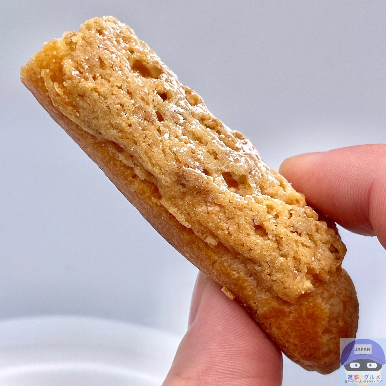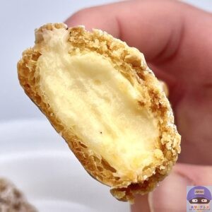 やわらかなシュー生地に、サクサク食感の生地を重ね、カシューナッツとアーモンドの香ばしさと風味、砂糖の甘みを感じます。