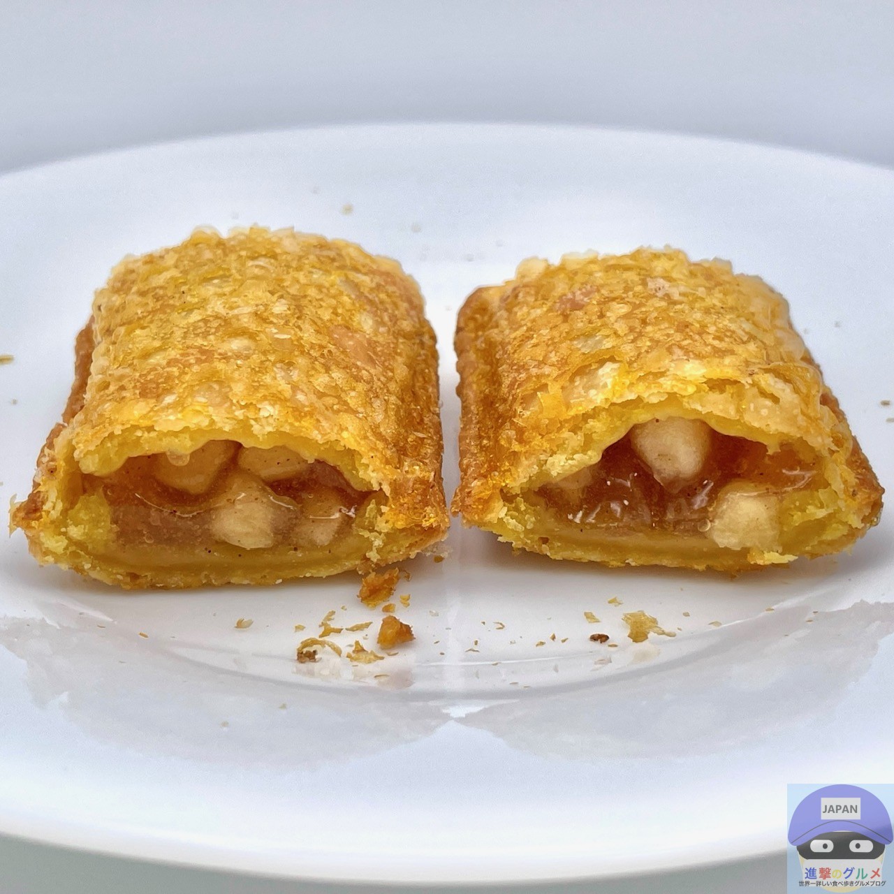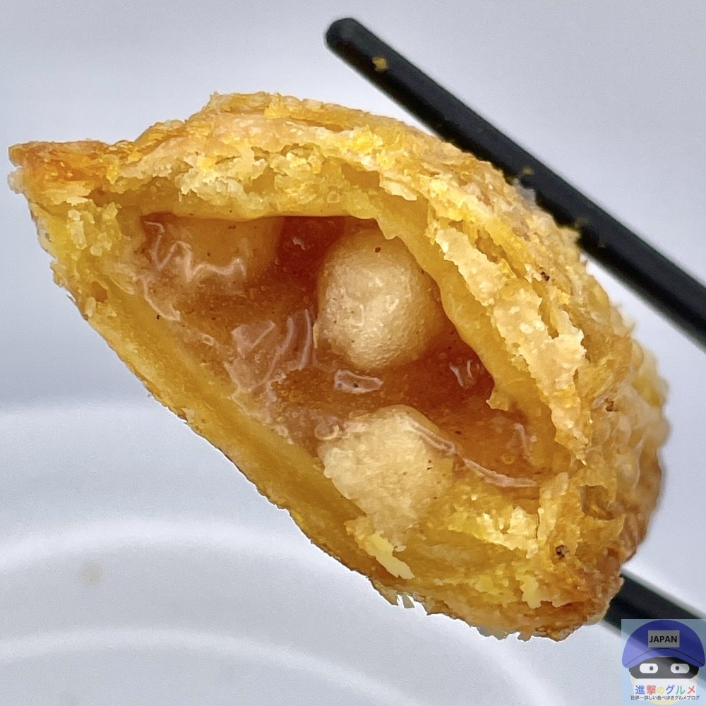 少しだけシャキッとした果肉の甘酸っぱさ、シナモンの風味、揚げたパイ生地の旨みを感じて甘すぎず、クセになるおいしさに仕上がっています。