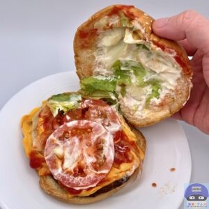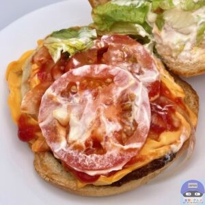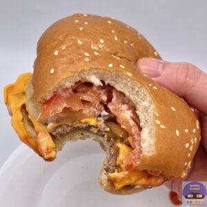 チェダーチーズ3枚重なった部分の濃いめのコクに、ケチャップ・トマト・ピクルスの酸味と甘み、こってりまろやかなマヨソースがたまらない、オニオンの程よい辛みがアクセントです。