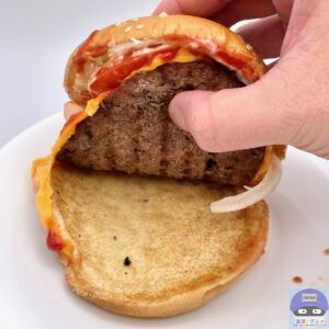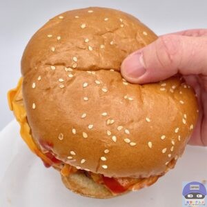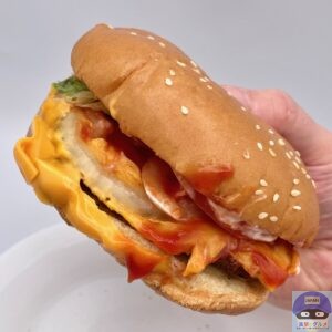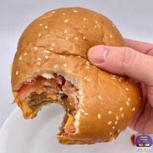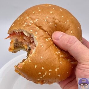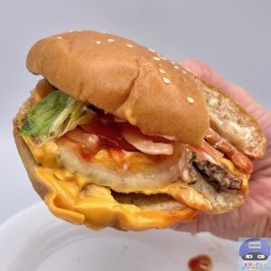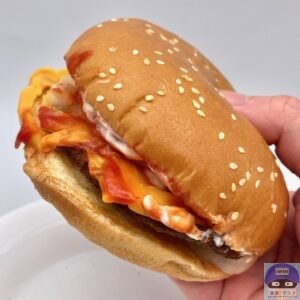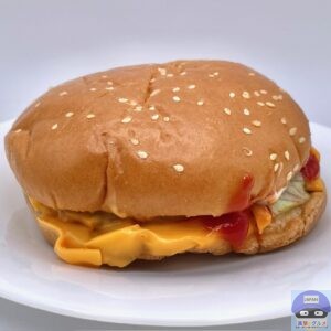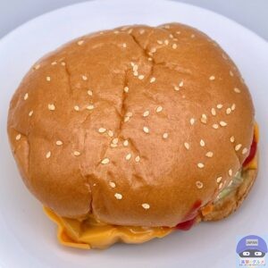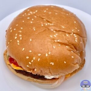 ふんわりした大きなバンズがチーズ3枚と多めのソースをしっかり受け止め、食べごたえ抜群、具材たっぷりで満足度の高いハンバーガーです。